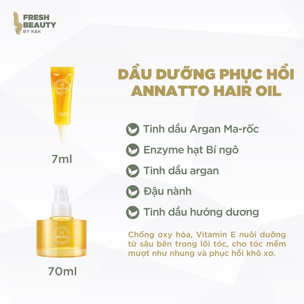 (Size nhỏ) Dầu dưỡng tóc British M Annatto Hair Oil phục hồi tóc hư tổn, khô xơ, chẻ ngọn, gãy rụng cho tóc óng mượt, tơi mềm 7ml