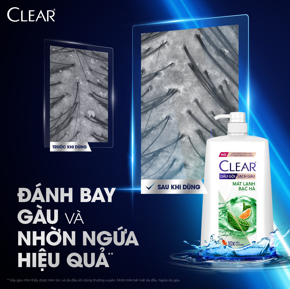 - Clear thế hệ mới với 10X Niacinamide dưỡng ẩm chuyên sâu cho lớp tế bào dưới da đầu, từ đó tăng cường hàng rào bảo vệ da đầu. Khi da đầu khỏe mạnh, vi khuẩn gàu (mà luôn tồn tại trên da đầu) không dễ dàng tấn công, từ đó ngăn gàu quay lại tối đa