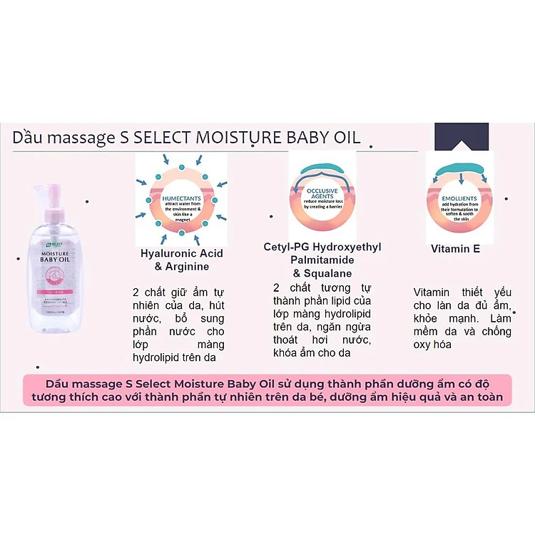 Mua tại TiktokThành phần Mineral Oil, Squalane, Sodium Hyaluronate, Cetyl-PG Hydroxyethyl Palmitamide, Arginine, Tocopheryl Acetate. Công dụng Sản phẩm giúp tăng cường độ ẩm và làm mềm mịn da, giúp ngăn ngừa và cải thiện tình trạng da thô ráp, bong tróc, sần sùi do thiếu ẩm, dưỡng da mềm mại, mịn màng. HDSD: Lấy một lượng sản phẩm vừa đủ ra lòng bàn tay sau đó thoa đều lên da và nhẹ nhàng massage khắp cơ thể bé. Lưu ý: Ngưng sử dụng và hỏi ý kiến bác sĩ nếu da bị kích ứng với các biểu hiện: nổi mẩn đỏ, sưng, ngứa. Tránh để sản phẩm tiếp xúc trực tiếp với mắt. Để xa tầm tay trẻ em. Bảo quản: Nơi khô ráo, thoáng mát, tránh tiếp xúc ánh sáng trực tiếp.