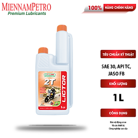 Mua tại TiktokTHÔNG TIN SẢN PHẨM: Lictor 2t là dầu nhớt 2 thì, loại nhớt pha xăng tiên tiến, được đặc chế với công nghệ JASO để ngăn ngừa tác tác động có hại của nhiệt độ cao bên trong động cơ của xe máy. Công thức giúp bảo vệ động cơ khỏi bụi cặn và ngăn ngừa kẹt pít-tông. ĐẶC TÍNH: Công nghệ không bụi than đảm bảo cháy hoàn toàn, giữ sạch bugi, piston, xi lanh. Khả năng bôi trơn tốt khi pha xăng 1:50, đảm bảo độ kín giúp động cơ hoạt động tối đa, tăng tốc nhanh. Bảo vệ động cơ tối đa. THÀNH PHẦN: Dầu khoáng và phụ gia. THÔNG SỐ KỸ THUẬT: Dầu đáp ứng được các yêu cầu: SAE 30, API TC, JASOFB. ỨNG DỤNG: Thích hợp cho xe máy 2 thì đời mới của Nhật Bản và Châu Âu. BẢO QUẢN VÀ AN TOÀN: Tồn trữ dưới mái che, nơi khô ráo, thoáng mát, nhiệt độ dưới 60oC. Tránh tiếp xúc trong thời gian dài và thường xuyên với dầu đã dùng. Để bảo vệ môi trường, thải bỏ dầu đúng qui định. Xuất xứ Việt Nam Phân phối bởi Miền Nam Petro NSX và HSD: Xem trên bao bì sản phẩm