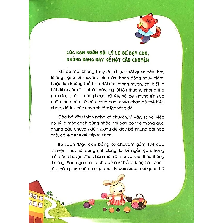 Tâm hồn trẻ em như tờ giấy trắng, sự dẫn dắt, dạy dỗ của cha mẹ sẽ là những nét vẽ đầu tiên trong bức tranh cuộc đời của con. Các bé còn nhỏ tuổi, thường sẽ có nhiều điều cần được uốn nắn, hướng dẫn. Thay vì nói lý thuyết, giảng giải đạo lý khô khan, cha mẹ có thể thông qua những câu chuyện dễ thương để dạy bé những bài học nhỏ mà thiết thực, hẳn là bé sẽ dễ tiếp thu hơn.CẨN THẬN NGƯỜI LẠ gồm những câu chuyện có nội dung gần gũi, dễ hiểu, qua đó bé sẽ học được tính cảnh giác, ý thức tự bảo vệ bản thân khi gặp nguy hiểm trong cuộc sống.Hy vọng bộ sách “Dạy con bằng kể chuyện” sẽ trở thành người bạn đồng hành đáng yêu và thân thiện trên con đường bé lớn khôn và trưởng thành.