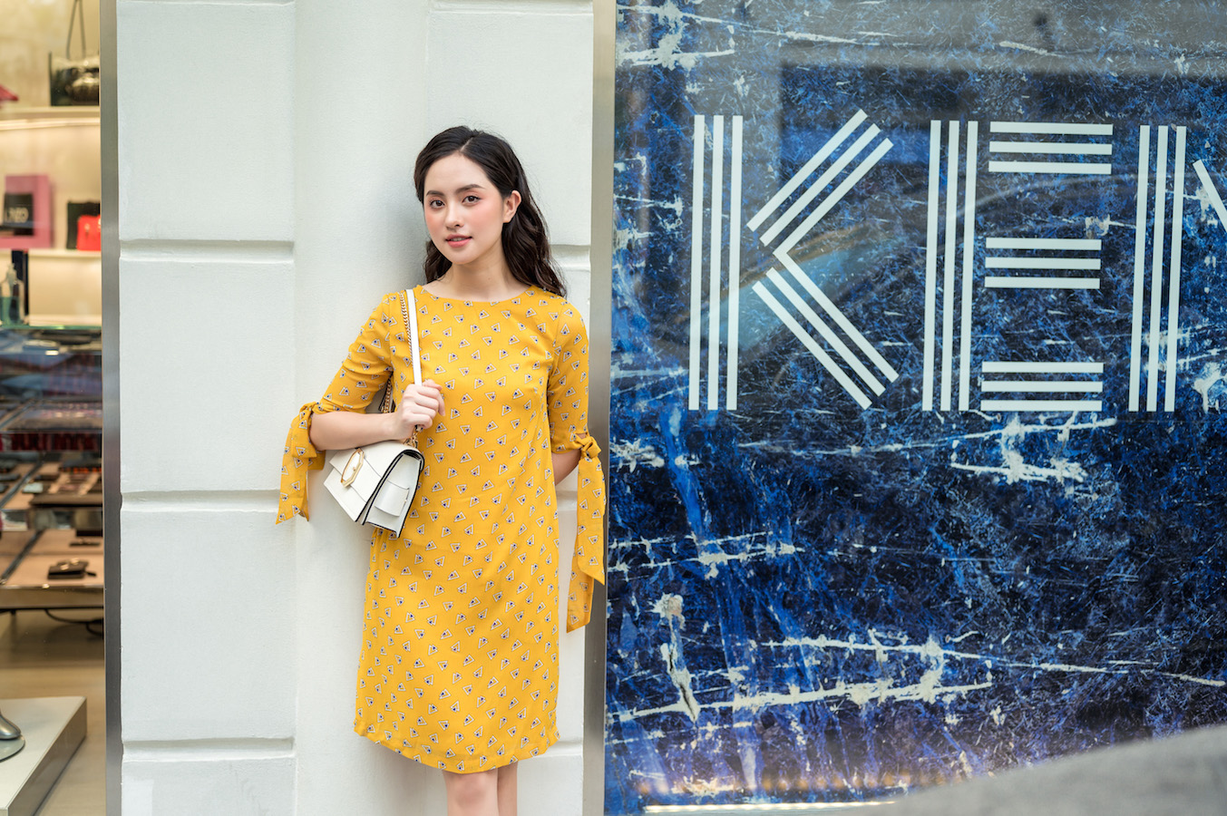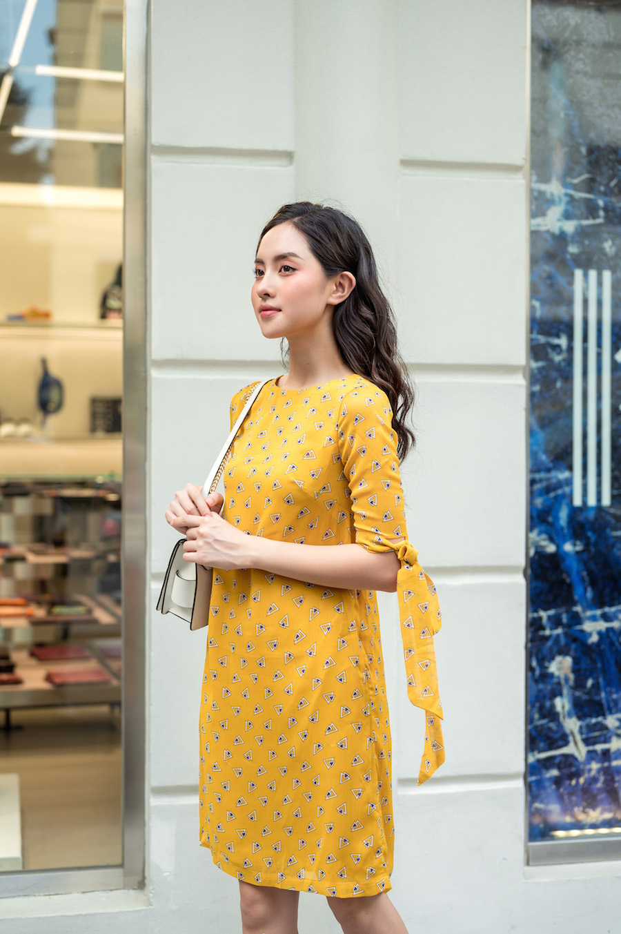 ✨De Leah - Đầm Suông Tay Lỡ Dây Nơ - Vàng hoạ tiết