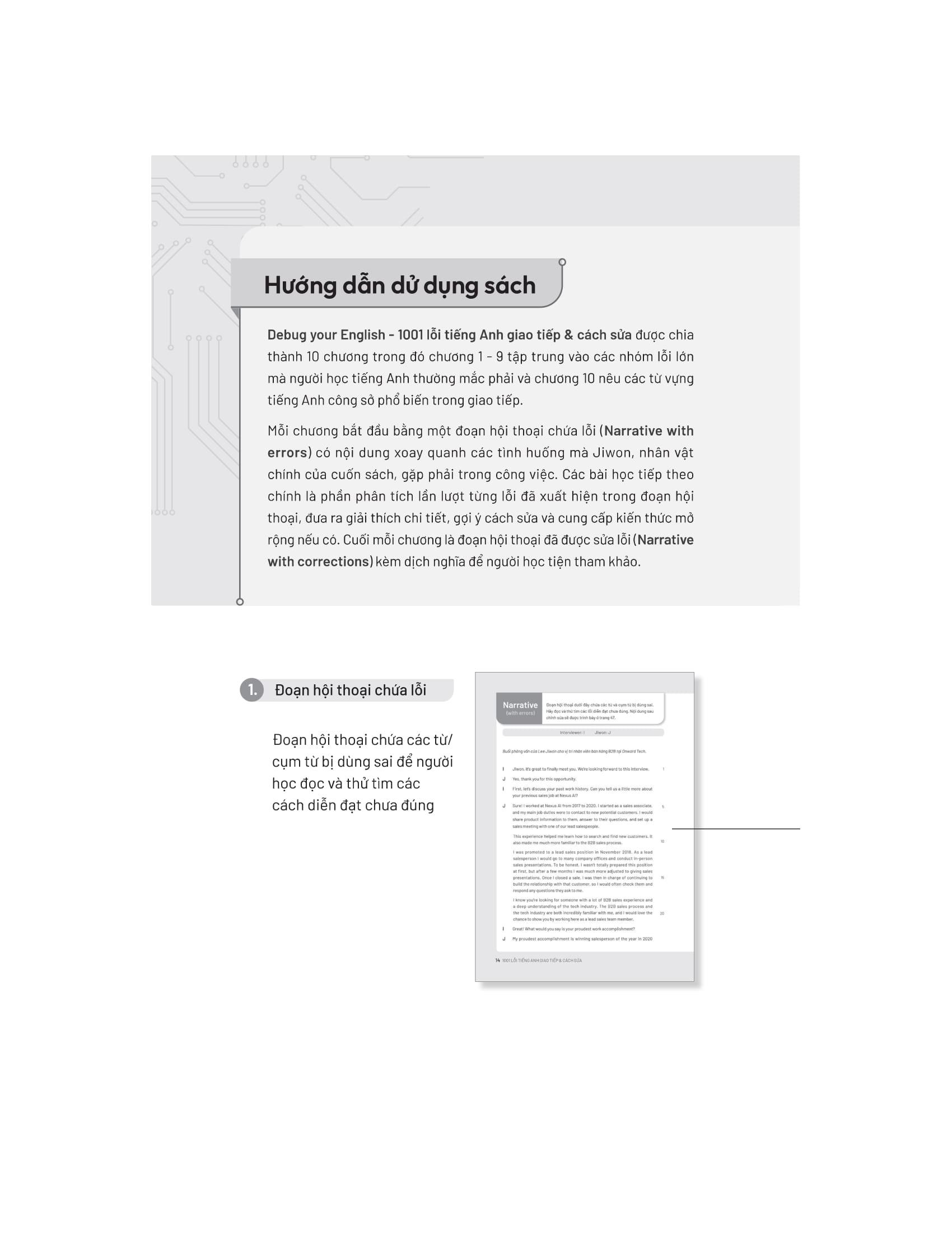 1001 lỗi tiếng Anh giao tiếp & cách sửa – Debug your English là cuốn sách tổng hợp các lỗi sai phổ biến mà người học tiếng Anh thường mắc và chia thành các nhóm lỗi lớn như lỗi dùng sai giới từ, lỗi ngữ pháp, lỗi dùng từ, lỗi diễn đạt thiếu tự nhiên. Từ các tình huống giao tiếp thực tế trong công việc, sách chỉ ra các lỗi sai và đề xuất cách sửa, giải thích sắc thái của từ, đồng thời cung cấp thông tin mở rộng và ví dụ ứng dụng.