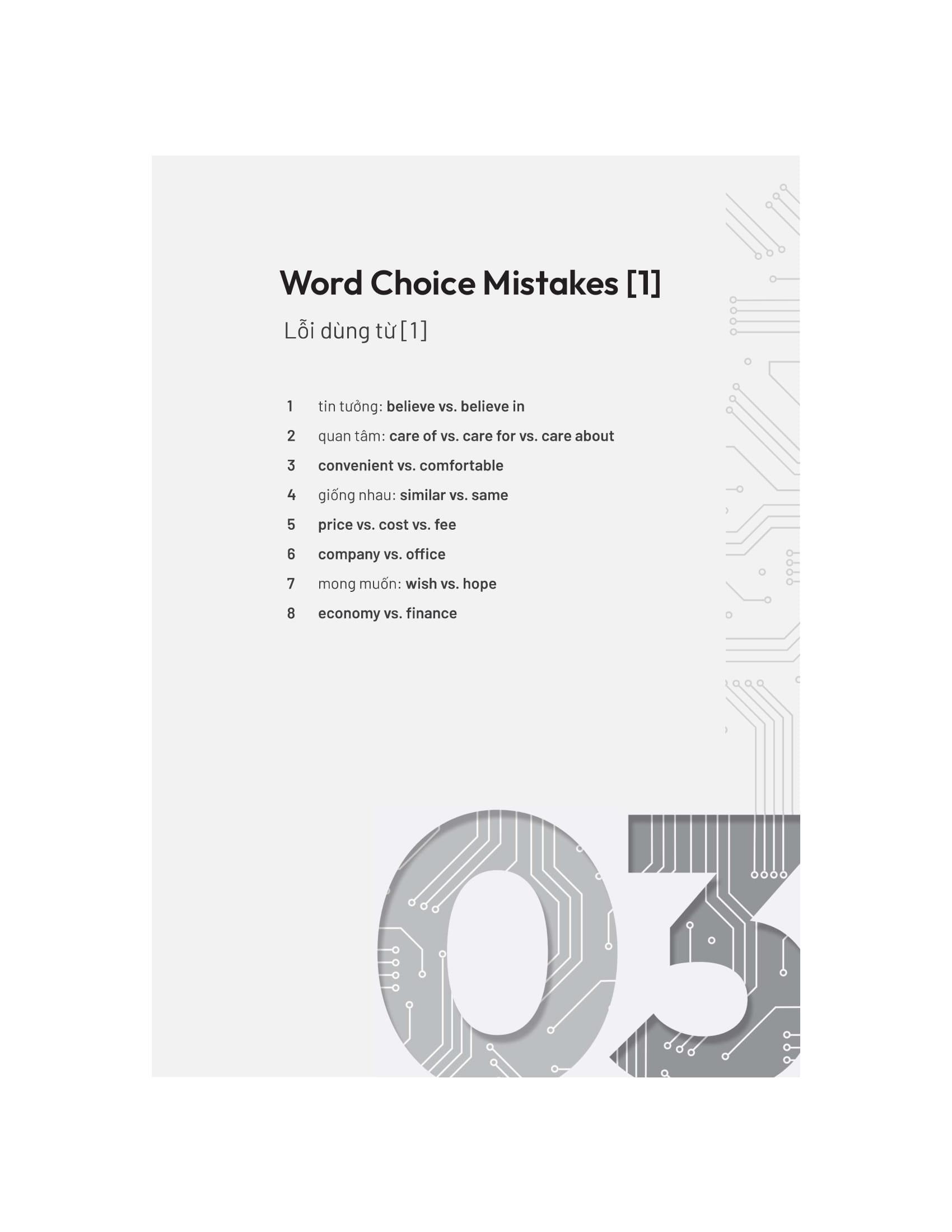 Sách được chia thành 10 chương, trong đó chương 1-9 tập trung vào các nhóm lỗi lớn mà người học tiếng Anh thường mắc phải, và chương 10 đưa ra các từ vựng tiếng Anh công sở phổ biến.