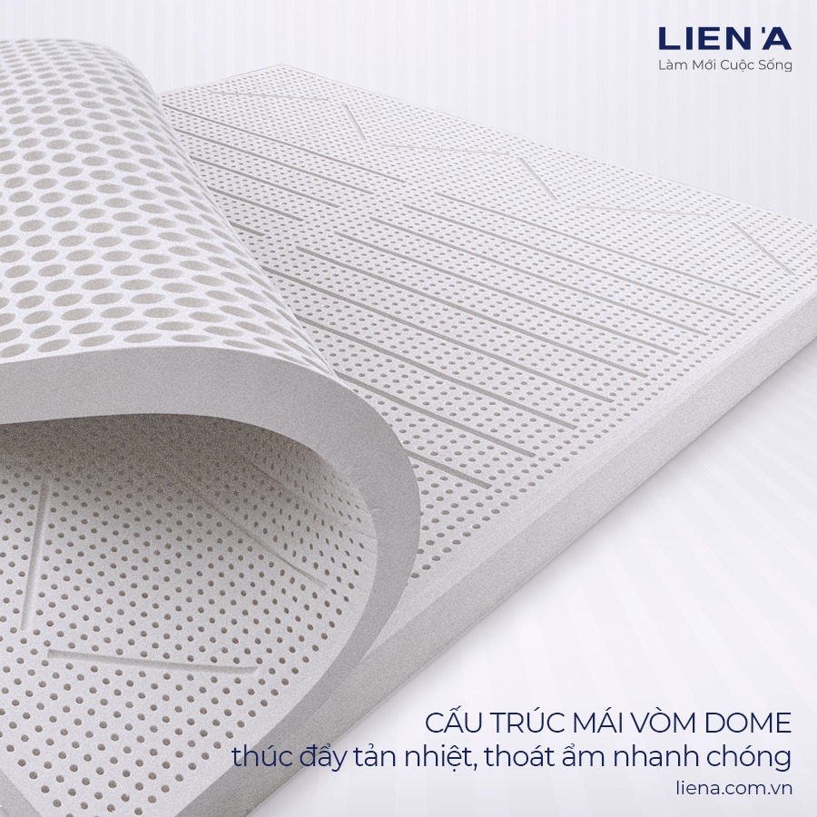 Liên Á tiên phong ứng dụng thành công cấu trúc vòm vào dòng nệm cao su thiên nhiên thế hệ mới. Nệm được thiết kế với hàng ngàn lỗ thông hơi tròn có mái vòm có tác dụng thúc tản nhiệt, đưa không khí thoát hơi nhanh hơn. Kết cấu vòm giúp tăng cường độ bật nảy cho nệm, nâng đỡ tối ưu trọng lượng cơ thể, giữ cho cơ thể luôn ở trạng thái thoải mái, thư giãn, nệm cũng chắc chắn và bền bỉ hơn trong việc hạn chế xẹp lún, mất dáng sau thời gian sử dụng.