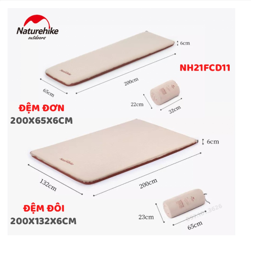 ĐỆM/ NỆM DÃ NGOẠI TỰ BƠM HƠI NATUREHIKE NH21FCD11 THÔNG TIN SẢN PHẨM: - Thương hiệu: NatureHike - Dòng sản phẩm: Glamping - Mã sản phẩm: NH21FCD11 - Chất liệu: Vải co giãn 30D, Vải Pongee 190T - Kích thước & Trọng lượng: + Đệm đơn: Kích thước sử dụng 200656cm; Kích thước gấp gọn 2232cm; Trọng lượng 1800g + Đệm đôi: Kích thước sử dụng 2001326cm; Kích thước gấp gọn 30*65cm; Trọng lượng 3600g - Màu sắc: Khaki, Xanh olive - Xuất xứ: Trung Quốc