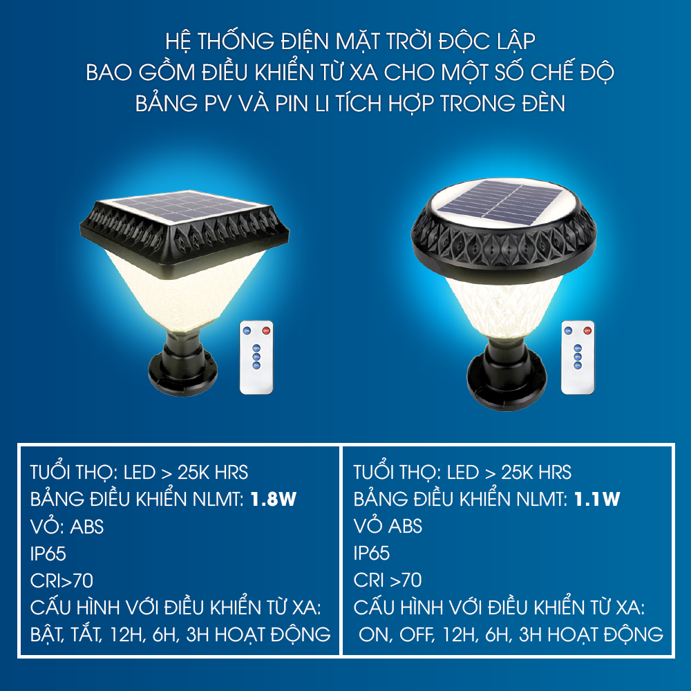 • Bảng điều khiển năng lượng mặt trời: vuông: 1.8W; tròn: 1.1W