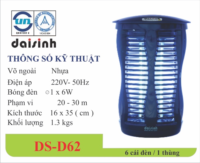 Đèn diệt côn trùng Phát ra tia UAV để thu hút côn trùng, ruồi, muỗi và các loại côn trùng bay trong phạm vi 360 độ xung quanh đèn. Khi côn trùng bay vào thân đèn, tiếp xúc vào lưới điện sẽ bị tiêu diệt bởi hệ thống lưới điện áp cao.Thiết kế hiện đại, kích thước phù hợp nhưng mang lại hiệu quả cao. Khung nhựa bên ngoài có độ an toàn cao. Thiết kế sang trọng, ánh sáng dịu nhẹ có thể vừa sử dụng bắt muỗi vừa làm đèn ngủ.  Không gây ô nhiễm môi trường, không gây khói hay mùi khó chịu. Đèn phát tia UV là hoàn toàn vô hại với cơ thể người, trẻ em  và vật nuôi. Sản phẩm  của Đại Sinh  là đơn vị đầu tiên tại Việt Nam được Trung tâm III cấp Giấy chứng nhận an toàn chất lượng về tiêu diệt côn trùng.  thích hợp đặt trong phòng Phòng khách, Nhà bếp, Phòng ngủ