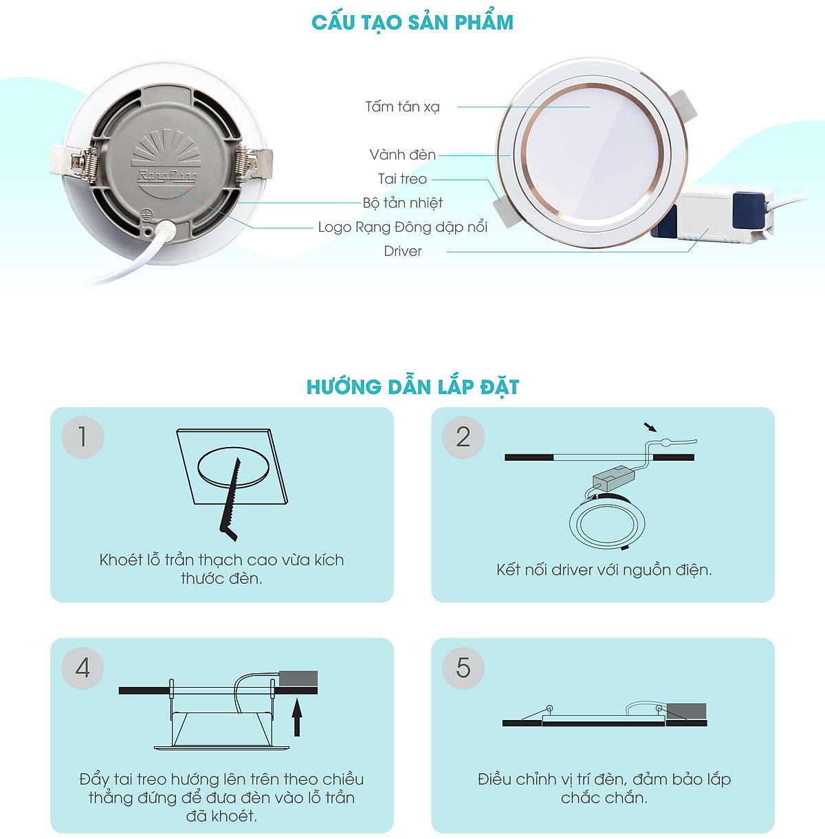 Công suất: 12W Điện áp: 220V/50Hz Quang thông: 930lm/910lm Nhiệt độ màu: 6500K/3000K Kích thước (ØxH): (138x50)mm ĐK lỗ khoét trần: 110mm - Sử dụng Chip LED Samsung đạt độ tin cậy cao - Chất