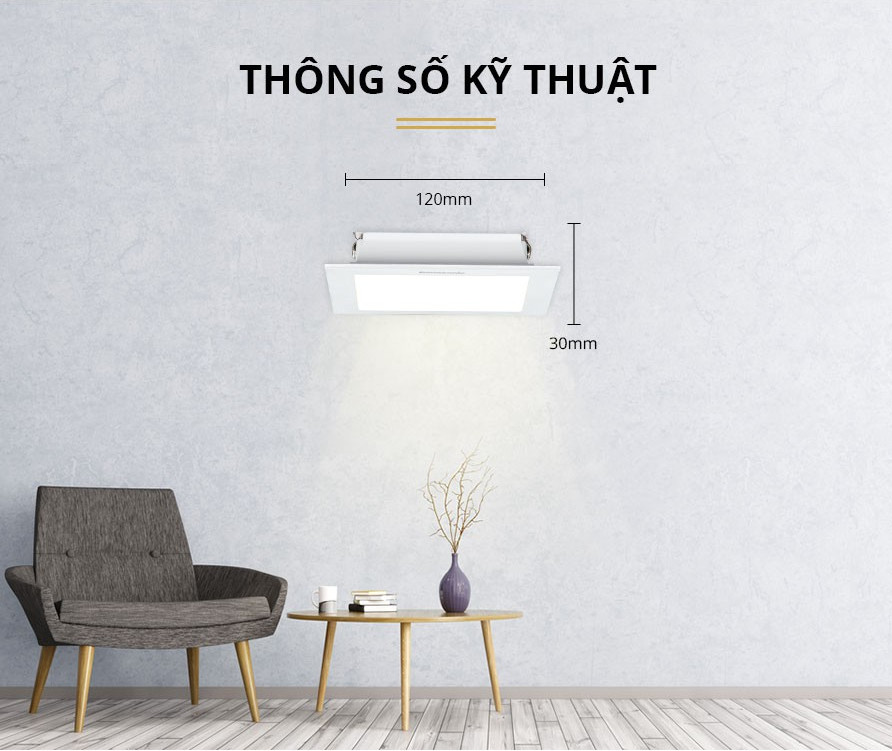 Đường kính khoét lỗ / Công suất: 110/12W. Dải điện áp hoạt động: (150V - 250V)/50Hz Quang thông: 930lm/910lm Nhiệt độ màu: Sáng trắng 6500K/ Sáng vàng 3000K Kích thước (ØxH): (138x50)mm ĐK lỗ khoét