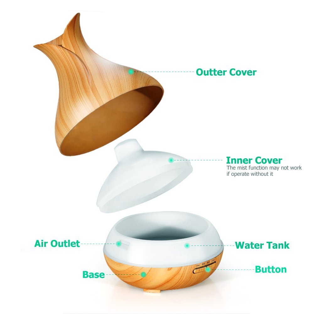 THÔNG TIN SẢN PHẨM - Màu sắc: gỗ sáng/ gỗ tối - Kích thước: 17*17*22.7cm - Chất liệu: Nhựa ABS - Dung tích: 500ml - Trọng lượng: 400g - Công suất: 8W - Diện tích