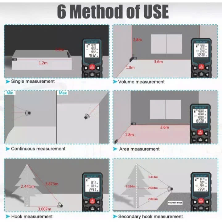 Máy Kết Hợp Phần Mềm Thông Minh. Đo Tính Đường Thằng, + Nối Với Nhau Được. - Có Thể Đo Tính Diện Tích Tích Hơp Sẵn Trong Máy, Bạn Cần Đo chiều dài 2 cạnh máy tự động cho ra kết quả diện tích. M2 - Có Thể Đo Tính Thể Tích , Tích Hợp Phần Mềm Thông Minh Có Sẵn Bạn Chỉ Cần Đo Diện Tích 3 Cạnh, Dài, Rộng, Cao. Máy Cho Ra Kết Quả Thể Tích m3 - Có Thể Tính Chiều Dài Còn lại Théo Phương Pháp Pitago Lập Trên máy Đơn Giản Gọn Nhẹ Nhất