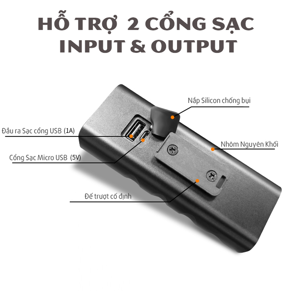 Hỗ trợ Sạc qua Cổng USB tiện lợi với viên pin 18650 tích hợp