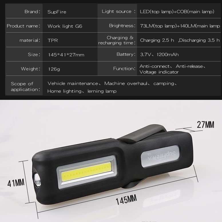 Đèn pin siêu sáng Supfire G6 sử dụng nguồn là 2 loại bóng đèn khác nhau với công suất chiếu sáng tối đa lên đến 3W. Một đèn LED ở phần đỉnh đèn pin sử dụng để chiếu xa, đèn COB còn lại ở phần thân sử dụng để chiếu ánh sáng tỏa cho vùng sáng rộng hơn. Với thiết kế đem lại sự tiện lợi nhất cho người sử dụng, Supfire G6 thiết kế với một móc treo có thể xoay 360 độ phù hợp với moi vị trí khác nhau như trên dây, trên cành cây, hay móc vào vị trí nào đó để chiếu sáng. Phần đế đèn sử dụng nam châm từ tính có thể hút được kim loại, nhờ vậy bạn có thể gắn đèn pin lên cửa, lên thân xe hay bất kì vị trí nào thuận lợi nhất.