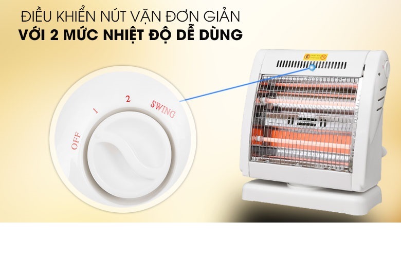 - Tự động ngắt điện khi quạt bị nghiêng hay đổ Đèn Sưởi Điện Halogen FUJIKA FJ-SNV1 - Hàng Chính Hãng là một trong những thiết bị sưởi ấm không thể thiếu tại gia đình trong mùa đông. Sản phẩm sử dụng đèn Halogen, tỏa nhiệt đều, làm ấm nhanh, không gây khó thở và khô da, đảm bảo an toàn cho người sử dụng. Kiểu dáng sang trọng, hiện đại Đèn Sưởi Điện Halogen FUJIKA FJ-SNV1 - Hàng Chính Hãng có thiết kế sang trọng hơn, kiểu dáng hiện đại và bắt mắt, nhỏ gọn tiết kiệm diện tích và phù hợp mọi không gian như phòng khách, phòng ngủ, Điều khiển dễ dàng bằng nút xoay Đèn Sưởi Điện Halogen FUJIKA FJ-SNV1 - Hàng Chính Hãng có 2 mức công suất 400W, 800W điều chỉnh bằng núm vặn linh hoạt theo 2 chiều giúp bạn dễ dàng lựa chọn được mức nhiệt phù hợp với môi trường và nhu cầu sử dụng. Chắc chắn, bền đẹp, an toàn Đèn Sưởi Điện Halogen FUJIKA FJ-SNV1 - Hàng Chính Hãng có chân đế vững chãi, lưới bảo vệ, tránh gây bỏng cho người dùng. Đặc biệt, lồng và vỏ nhựa phía sau chống cháy tuyệt đối, lưới tản nhiệt giúp sản phẩm không bị hư hỏng do quá nóng. TỎA NHIỆT ĐỀU, KHÔNG GÂY KHÔ DA Làm ấm cực nhanh, không gây khô da Đèn Sưởi Điện Halogen FUJIKA FJ-SNV1 - Hàng Chính Hãng sử dụng đèn halogen, làm ấm cực nhanh, độ bền vượt trội, chống chói mắt hiệu quả và không đốt cháy oxy nên không gây khó thở hay khô da khi dùng. Quay đảo chiều, tỏa nhiệt đều khắp phòng Sản phẩm có khả năng quay đảo chiều liên tục, giúp tỏa nhiệt đều khắp phòng, rất thích hợp khi sử dụng tại không gian rộng như phòng khách hoặc phòng có nhiều người. An toàn với người sử dụng Đèn Sưởi Điện Halogen FUJIKA FJ-SNV1 - Hàng Chính Hãng có chế độ tự động ngắt điện khi bị nghiêng đổ và hoạt động trở lại bình thường trở lại trạng thái an toàn. Thông số kỹ thuật