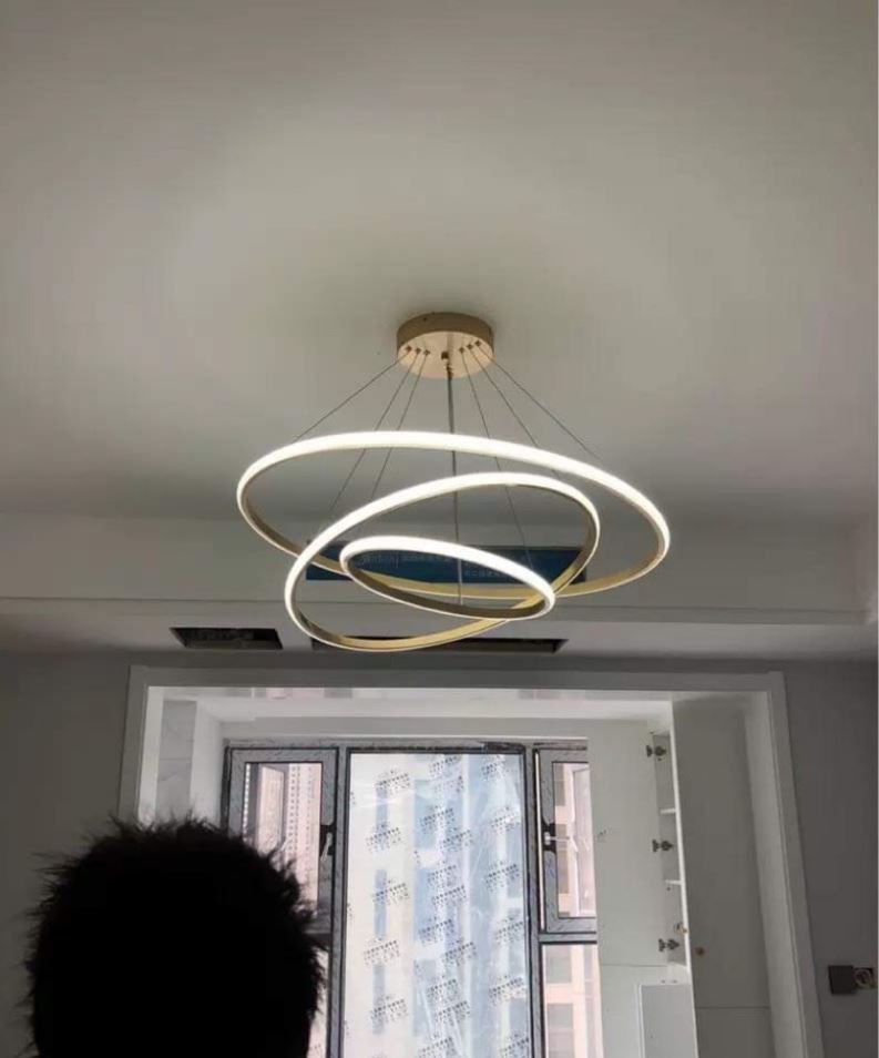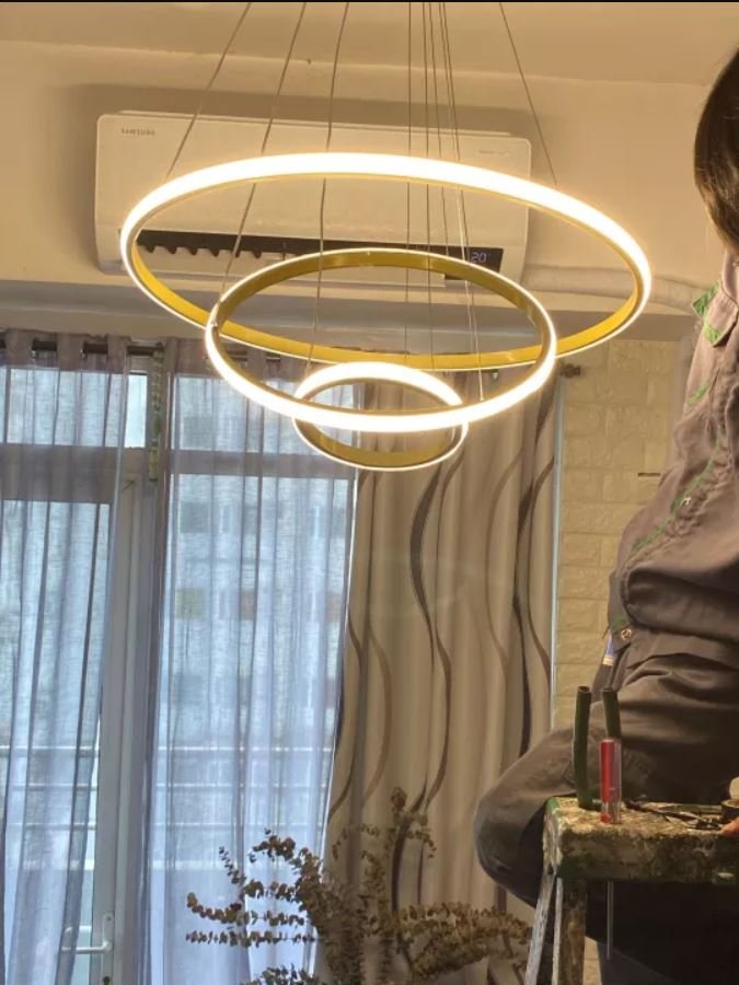 Đèn thả 3 vòng với phong cách thiết kế đơn giản nhưng sẽ giúp nổi bật không gian sống của gia đình bạn. Đèn thả 3 vòng là mẫu đèn thả được ưu chuộng nhất hiện nay, bởi giá thành hợp lý với khả năng tùy biến nhiều kiểu thả khác nhau, sẽ phù hợp với mọi không gian hiện đại.   -Điện áp vào: 220V 50Hz -Chất liệu: Thân nhôm sơn tĩnh điện + nhựa-mica dẫn sáng -Ánh sáng: Đổi 3 chế độ màu: Trắng/Vàng/Trung tính – 6000K -3000K- 4000k -Màu Sắc: Vàng -Loại Bóng: LED -Kích thước: đường kính lần lượt 60-40-20 (cm)   Đèn có điều khiển điều chỉnh chế độ ánh sáng từ xa vô cùng tiện dụng   Thiết kế sang trọng, hiện đại, thích hợp với nhiều không gian và phong cách nội thất.   Với điều khiển xa thông minh đèn có thể để chế độ ngủ đêm phục vụ cho nhu cầu xem phim, nghe ca nhạc   Chức năng thay đổi 03 ánh sáng Trắng 6000K, Vàng 3000K và Trung tính 4500K   Chức năng DIMMABLE: Tăng giảm ánh sáng của từng ánh sáng   Có cấu tạo chip led công nghệ cao giúp đèn phát huy được ánh sáng tối đa, ánh sáng thu được chân thực như ánh sáng ban ngày.   Tiết kiệm 80% điện năng.