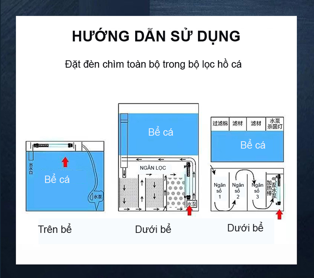 - Sử dụng tia UVC, ống thủy tinh thạch cao truyền tải tia cực tím tốt. Công dụng: Diệt rêu, nấm, diệt khuẩn hồ cá, bể cá, ngăn tảo sinh trưởng. Cách dùng: Đặt đèn ngập toàn bộ trong nước ở trong bể lọc, có thể là ngăn máy bơm, tốt nên đặt nằm ngang sao cho ánh sáng tác dụng lên nước là tối đa. Khi hồ đang bùng phát tảo, nên BẬT 24/24H cho tới khi hết sạch tảo. Khi chất lượng nước hồ ổn định, nên bật từ 2 – 4 tiếng/ngày tùy theo mức độ nắng và mái che hồ. Lưu ý: CHE CHẮN SÁNG SÁNG TỪ ĐÈN, KO ĐỂ ĐÈN TIẾP XÚC MẮT TRỰC TIẾP