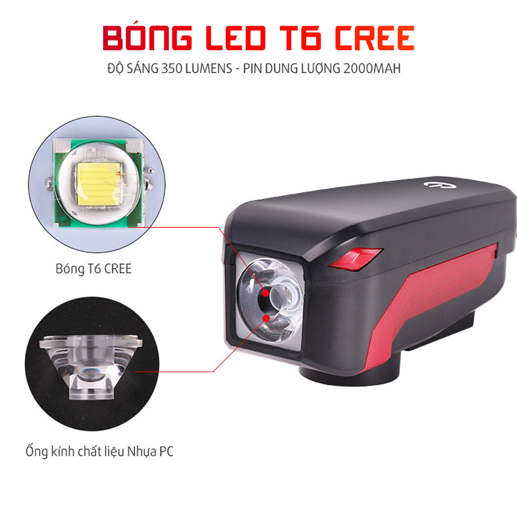 Đèn Xe Đạp Có Còi T6 350lumens (nút chạm cảm ứng) Pin 2000mAh Còi âm thanh lớn 140dB MaiLee