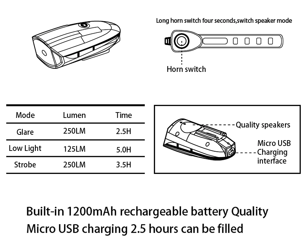 -Sản phẩm có 2 nút bấm 1 nút trên đèn để điều chỉnh đèn 1 nút bấm trên dây(dây dài khoảng 30cm) điều chỉnh còi. Sản phẩm sử dụng pin liền sạc lại qua cổng usb dung lượng pin lên đến 1200mah theo công bố của nhà sản xuất pin có thể sạc trên 500 lần và khi sạc đầy (rơi vào khoảng 2 giờ) tùy chế độ thời gian sử dụng sẽ khác nhau chế độ cường độ sáng (lumen) thời gian sáng mạnh 250LM 2.5H sáng mờ 125LM 5.0H nháy sáng 250LM 3.5H