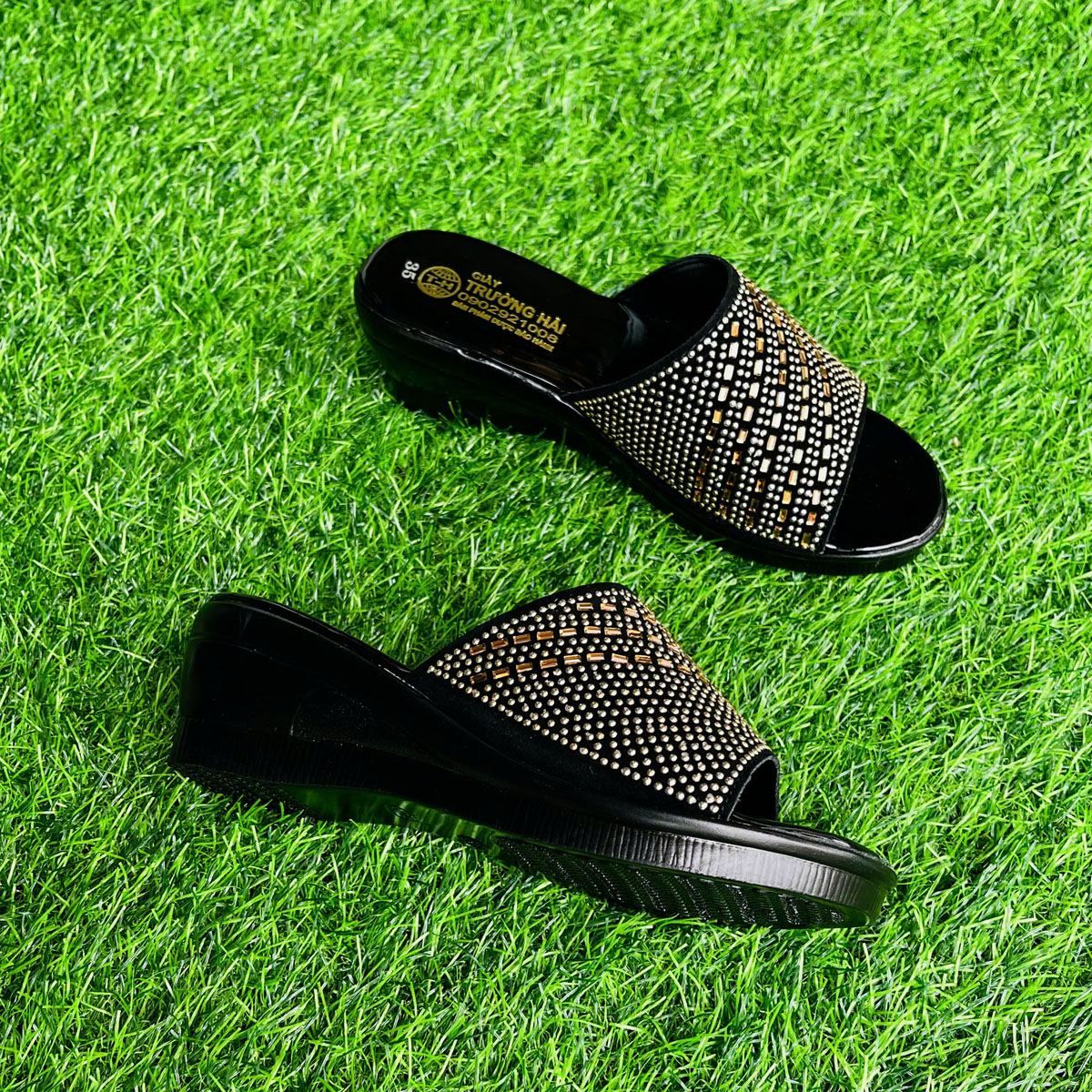✨Dép nữ trung niên đế xuồng 5cm Trường Hải màu đen đính đá DN125