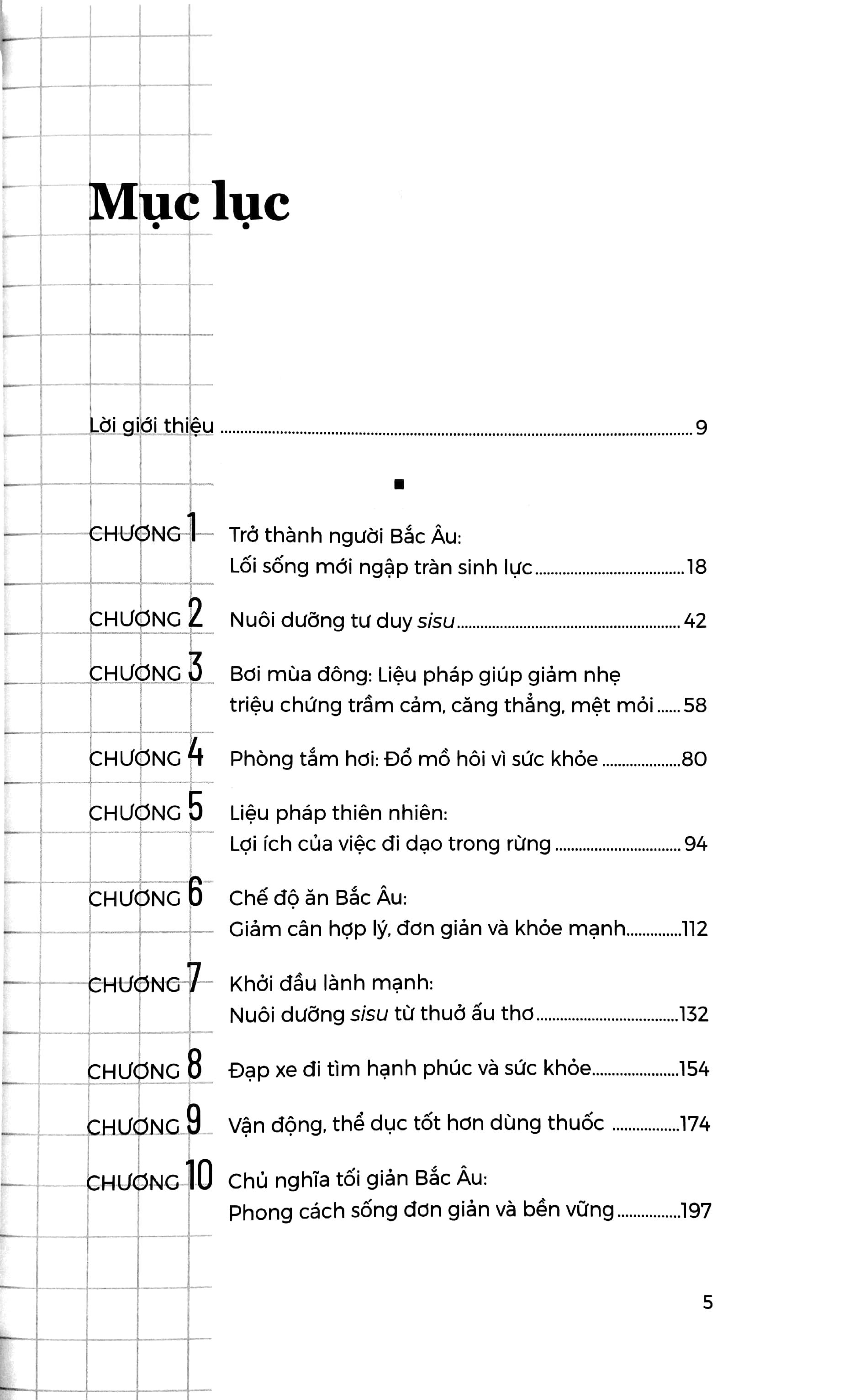 - Ăn uống lành mạnh: Chế độ ăn uống kiểu Bắc Âu giúp học cách nuôi dưỡng cơ thể, trí óc và tâm hồn. *Chủ nghĩa tối giản: Lối sống tối giản kiểu Bắc Âu giúp tiết kiệm chi phí và chú ý hơn đến mức độ hữu dụng của các vật dụng hằng ngày. Người Phần Lan coi lòng dũng cảm, sự gan dạ và quyết tâm như một đức tính quốc gia. Đi tìm Sisu mang đến những phương pháp đơn giản giúp mọi người áp dụng triết lý sisu vào cuộc sống hằng ngày, khám phá sức mạnh tiềm ẩn của bản thân để tồn tại và phát triển qua những giai đoạn khó khăn nhất.