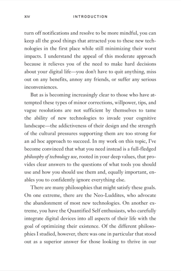 Now, Newport gives us a name for this quiet movement, and makes a persuasive case for its urgency in our tech-saturated world. Common sense tips, like turning off notifications, or occasional rituals like observing a digital sabbath, don't go far enough in helping us take back control of our technological lives, and attempts to unplug completely are complicated by the demands of family, friends and work. What we need instead is a thoughtful method to decide what tools to use, for what purposes, and under what conditions.
