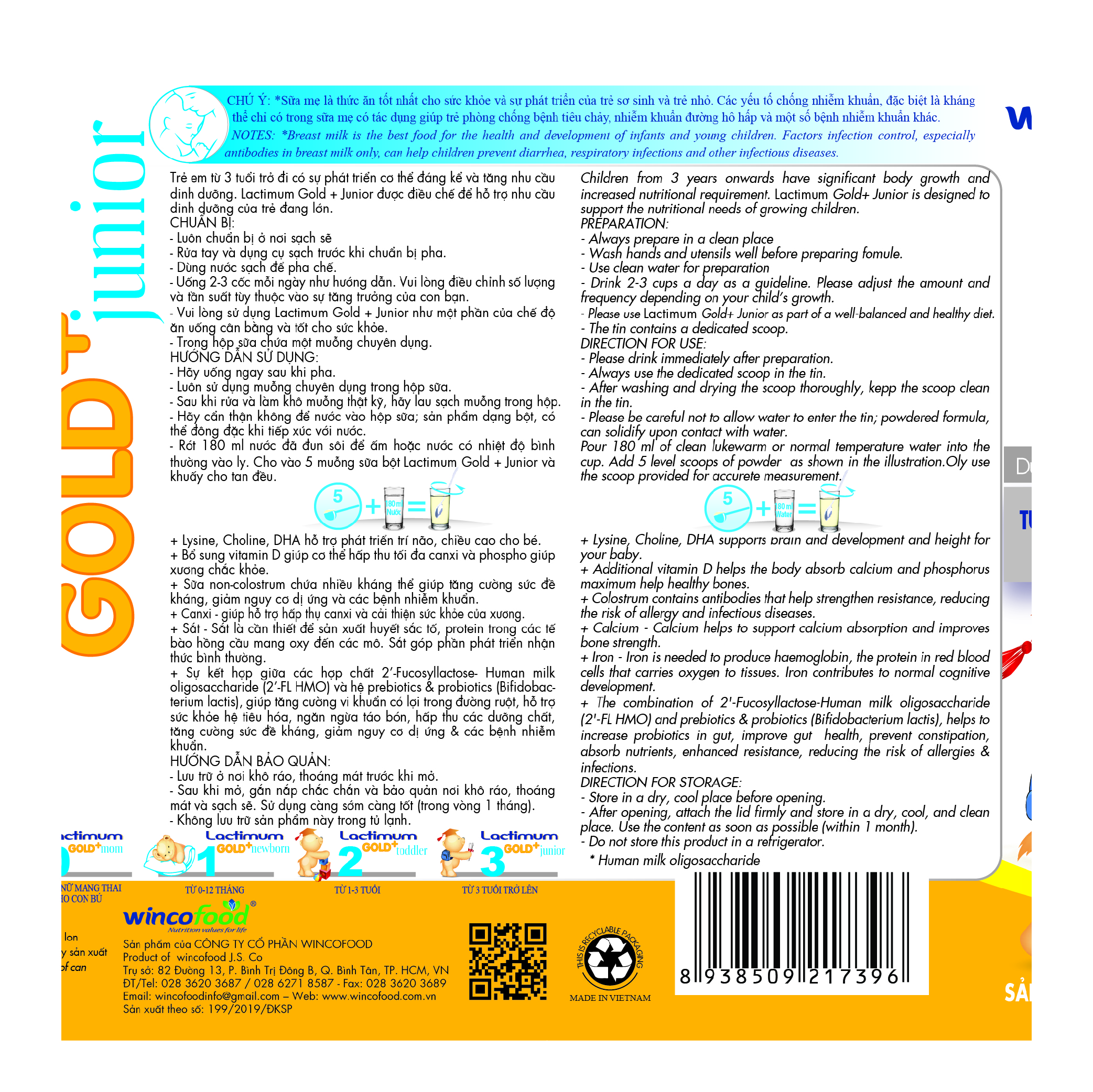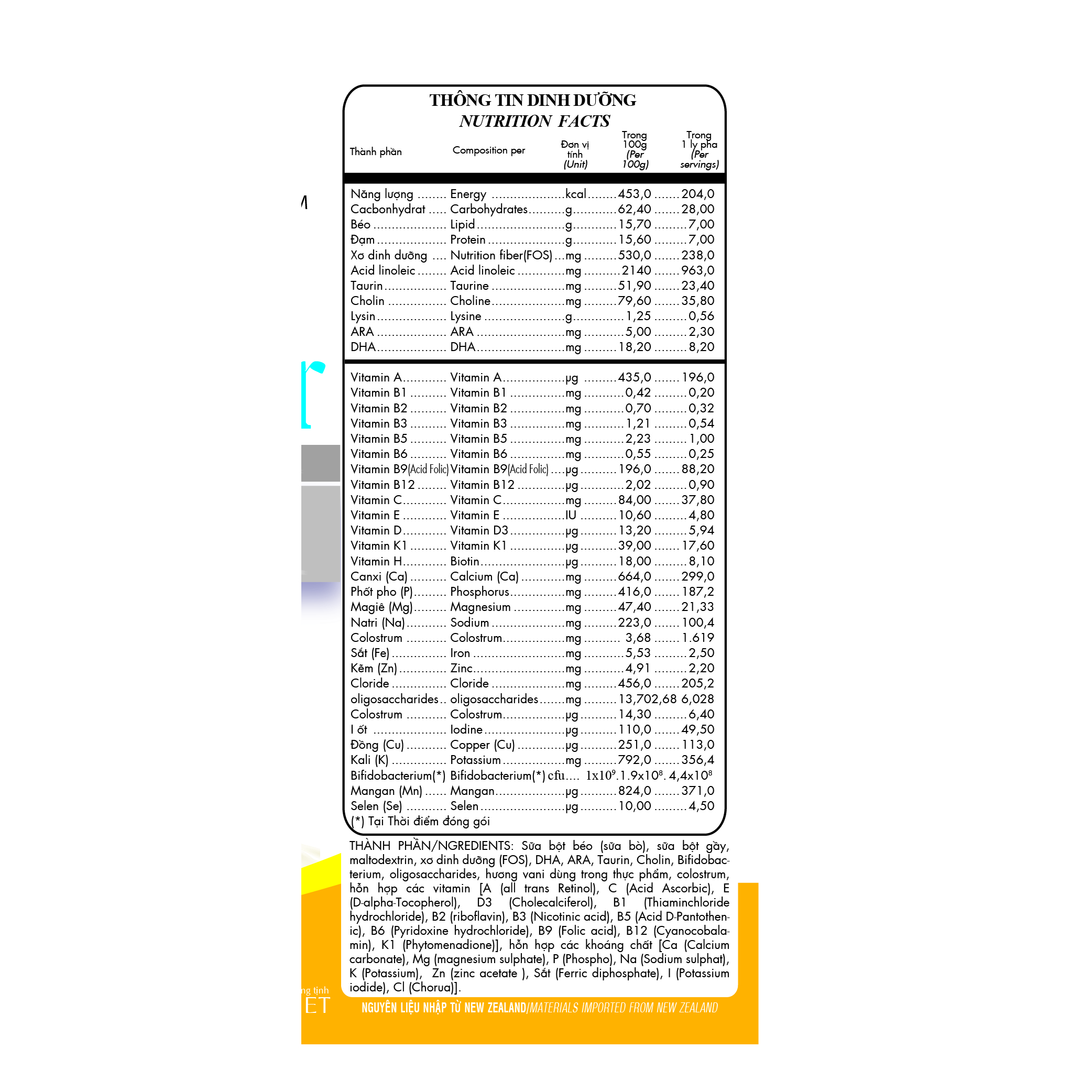Thành phần: Sữa bột béo (sữa bò), sữa bột gầy, maltodextrin, xơ dinh dưỡng (FOS), DHA, ARA, Taurin, Cholin, Bifidobacterium, oligosaccharides, hương vani dùng trong thực phẩm, colostrum, hỗn hợp các vitamin [A (all trans Retinol), C (Acid Ascorbic), E (D-alpha-Tocopherol), D3 (Cholecalciferol), B1 (Thiaminchloride hydrochloride), B2 (riboflavin), B3 (Nicotinic acid), B5 (Acid D-Pantothenic), B6 (Pyridoxine hydrochloride), B9 (Folic acid), B12 (Cyanocobalamin), K1 (Phytomenadione)], hỗn hợp các khoáng chất [Ca (Calcium carbonate), Mg (magnesium sulphate), P (Phospho), Na (Sodium sulphat), K (Potassium), Zn (zinc acetate ), Sắt (Ferric diphosphate), I (Potassium iodide), Cl (Chorua)].