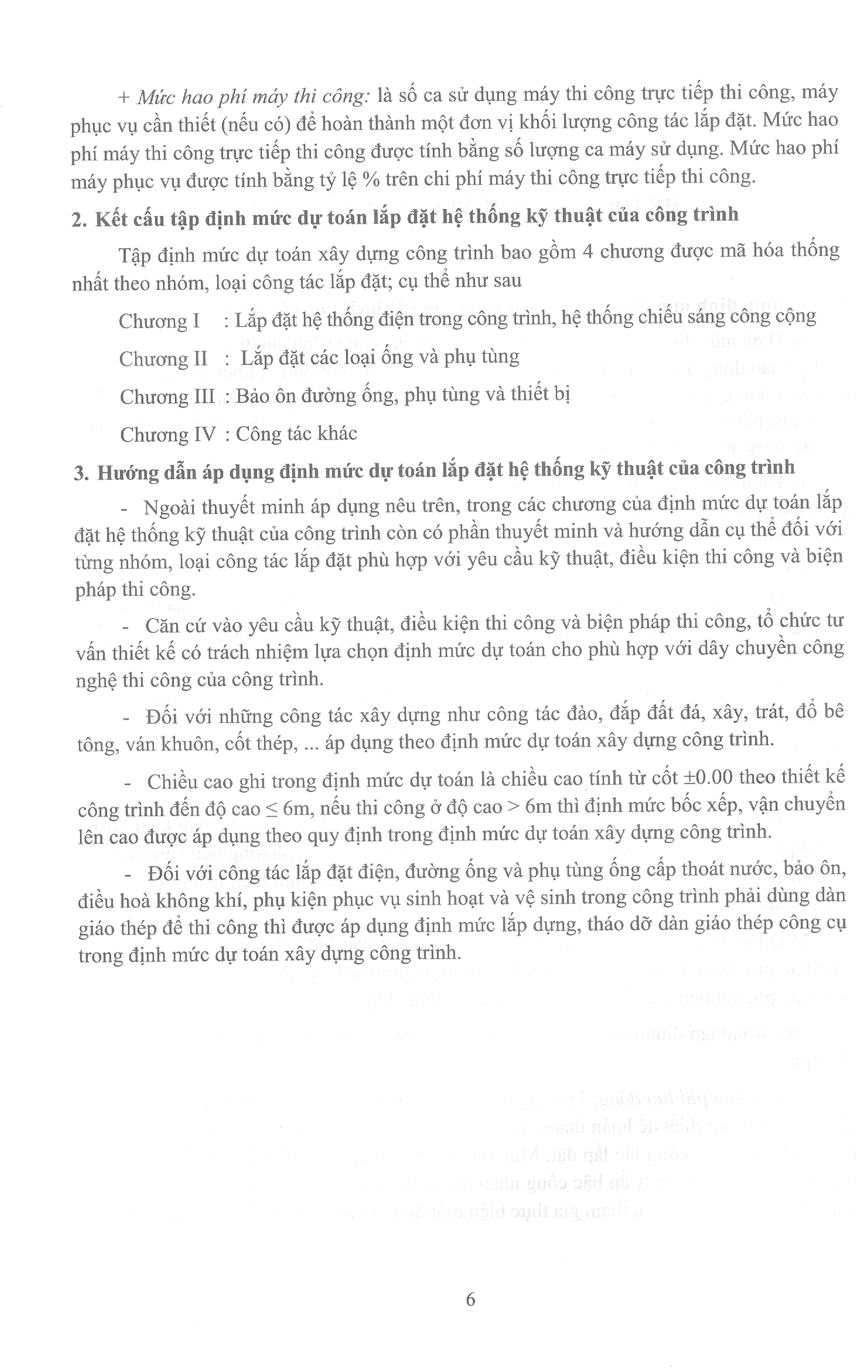 Định mức dự toán lắp đặt hệ thống kỹ thuật của công trình qui định mức hao phí về vật liệu, lao động, máy và thiết bị thi công để hoàn thành một đơn vị khối lượng công tác lắp đặt từ khi chuẩn bị đến khi kết thúc công tác lắp đặt theo đúng yêu cầu kỹ thuật, (kể cả những hao phí cần thiết do yêu cầu kỹ thuật và tổ chức sản xuất nhằm đảm bảo thi công xây dựng liên tục, đúng quy trình, quy phạm kỹ thuật).Định mức dự toán lắp đặt hệ thống kỹ thuật của công trình được lập trên cơ sở các quy chuẩn, tiêu chuẩn xây dựng; quy phạm kỹ thuật về thiết kế - thi công - nghiệm thu; mức độ sử dụng máy thi công; trang thiết bị kỹ thuật, biện pháp thi công và tiến bộ khoa học kỹ thuật trong lắp đặt.Định mức dự toán lắp đặt hệ thống kỹ thuật của công trình bao gồm: mã hiệu, tên công tác, đơn vị tính, thành phần công việc, qui định áp dụng (nếu có) và bảng các hao phí định mức; trong đó:Thành phần công việc qui định nội dung các bước công việc từ khi chuẩn bị đến khi hoàn thành công tác lắp đặt theo điều kiện kỹ thuật, điều kiện thi công và biện pháp thi công cụ thể.Bảng các hao phí định mức gồm:Mức hao phí vật liệu: là số lượng vật liệu chính, vật liệu phụ, các phụ kiện hoặc các bộ phận rời lẻ (không kể vật liệu phụ cần dùng cho máy móc, phương tiện vận chuyển và những vật liệu tính trong chi phí chung) cần thiết cho việc thực hiện hoàn thành một đơn vị khối lượng công tác lắp đặt.Mức hao phí vật liệu trong định mức đã bao gồm hao hụt vật liệu ở khâu thi công. Mức hao phí vật liệu chính được tính bằng số lượng phù hợp với đơn vị tính của vật liệu. Mức hao phí vật liệu phụ được tính bằng tỉ lệ % trên chi phí vật liệu chính.Ôxy trong tập định mức này được tính theo đơn vị chai có thể tích 40 lít và áp suất 15 MPa.Mức hao phí lao động: là số ngày công lao động của công nhân trực tiếp và công nhân phục vụ cần thiết để hoàn thành một đơn vị khối lượng công tác lắp đặt từ khi chuẩn bị đến khi kết thúc công tác lắp đặt. Mức hao phí lao động được tính bằng số ngày công theo cấp bậc công nhân, cấp bậc công nhân là cấp bậc bình quân của các công nhân trực tiếp và công nhân phục vụ tham gia thực hiện một đơn vị khối lượng công tác lắp đặt.