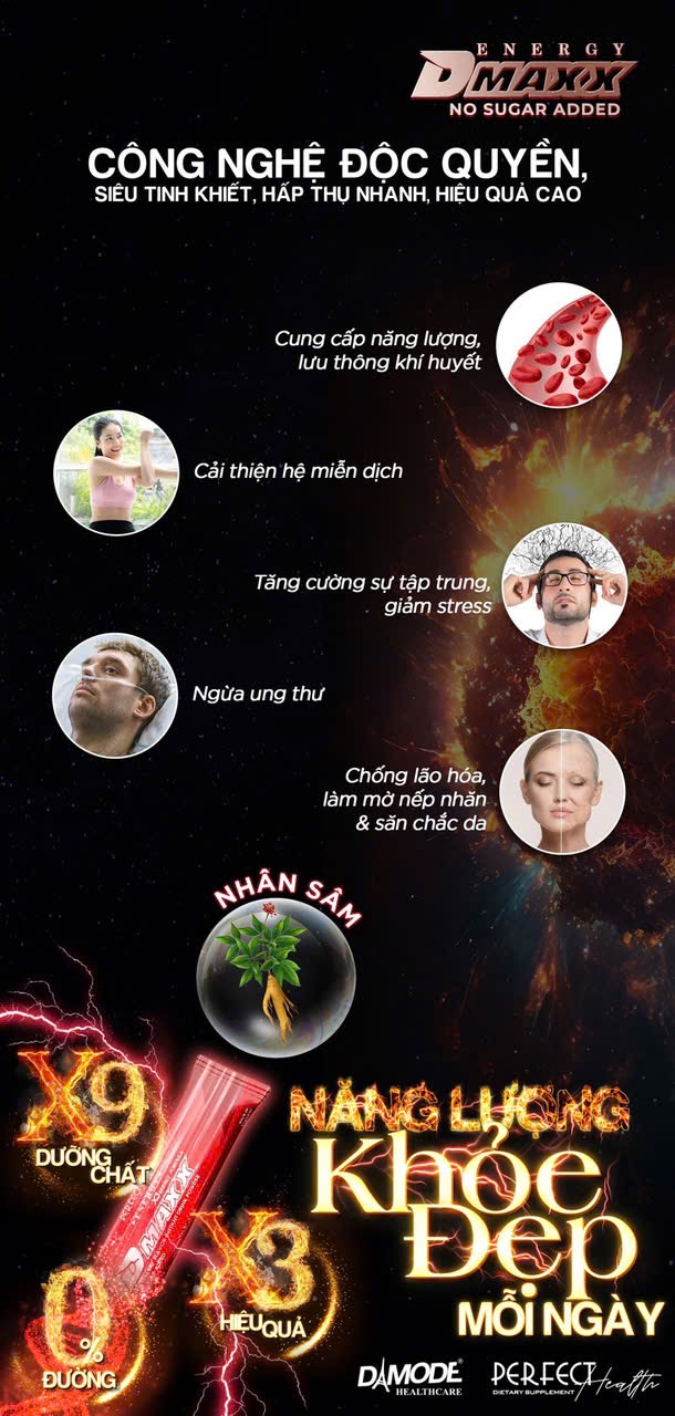 Thức uống năng lượng Dmaxx Energy Formula   Dmaxx energy formula là sản phẩm thức uống năng lượng có chức năng bổ sung năng lượng cho người uống mỗi ngày dưới dạng thức uống hòa tan. Sản phẩm có xuất xứ từ Thái Lan và đối tượng sử dụng là cả nam giới và nữ giới trong độ tuổi từ 18  tuổi. Sản phẩm là sự kết hợp từ chất được chiết suất từ trái cây thiên nhiên và hoạt chất axit hữu cơ tổng hợp. Sản phẩm có thiết kế nhỏ gọn và dễ dàng mang theo để sử dụng mỗi ngày. Đây là một trong những sản phẩm uống năng lượng được nhiều người tiêu dùng lựa chọn và tin dùng. Sản phẩm được chứng nhận và được kiểm tra lâm sàng trước khi đưa ra thị trường. Vì vậy người tiêu dùng hoàn toàn có thể yên tâm mua và sử dụng sản phẩm. Thành phần chính của Dmaxx energy formula: Thành phần của Dmaxx energy formula được kết hợp từ nhiều dưỡng chất tốt của trái cây và hoa chất axit hữu cơ tổng hợp. Các thành phần này chủ yếu là các dưỡng chất thiết yếu cần thiết cho cơ thể con người. Thành phần chính có trong Dmaxx Energy Formula gồm có: nhân sâm, cà chua, trà xanh, gừng,… Ngoài ra trong Dmaxx energy formula còn có các thành phần khác như: Sucrose, Dextrose, Malic Acid, Citric Acid Anhydrous, Guarana Extract, Tricalcium Phosphate, Mixed Berry Flavor, Sodium Chloride, Sucralose, L-Ornithine Hydrochloride, L-Arginine Hydrochloride, L-lysine Hydrochloride, Vitamin B12, Folic Acid, Ascorbic Acid,… Sản phẩm cam kết Có thành phần chiết suất 100 % từ thiên nhiên an toàn và dễ dàng sử dụng cho người sử dụng.  Công dụng của Dmaxx