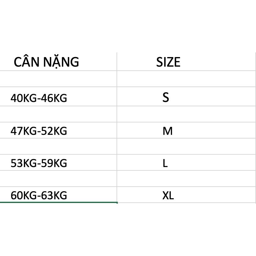 có size s,m,l,xl từ 40 đến 63kg size s 40 đến 46kg size m 47 đến 52kg size l 53 đên 59kg size xl từ 60 đến 63kg ạ