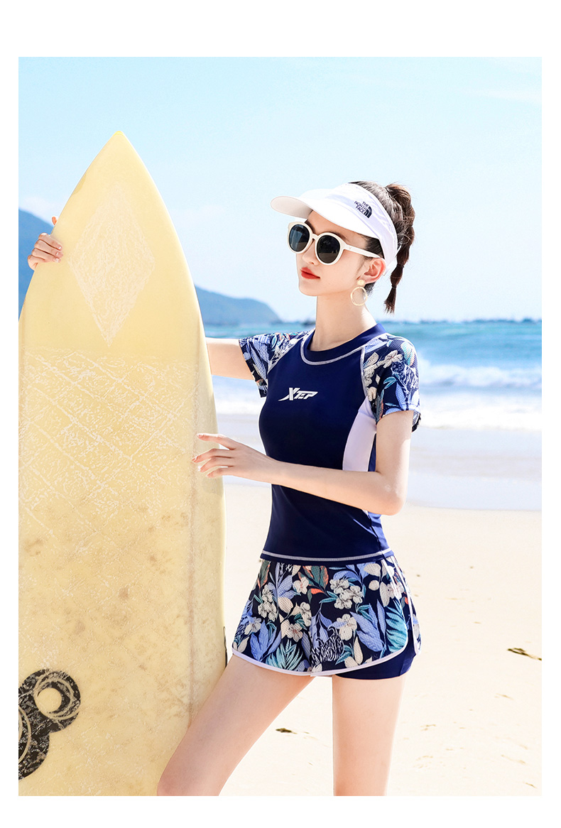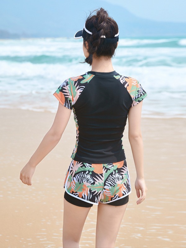 - Mẫu đồ bơi mới nhất cho các bạn nữ thích sự trẻ trung kín đáo mà vẫn thu hút khi đi biển, đi bơi. - Áo dáng ngắn tay phối hoạ tiết trẻ khoẻ,