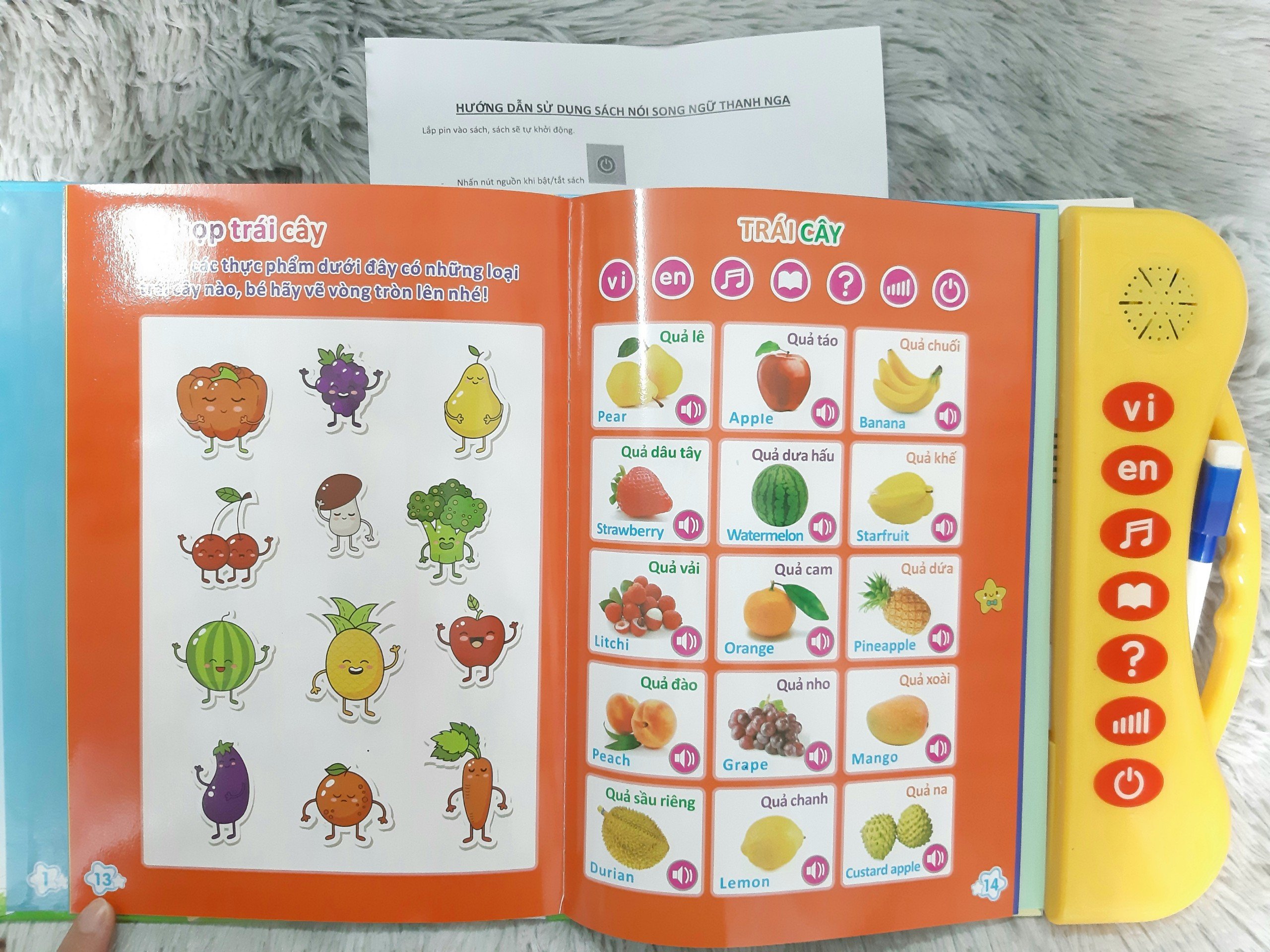 • Bảng nói với 24 trang theo nhiều chủ đề gần gũi, thú vị trong cuộc sống. Bé học về bảng chữ cái, con số, hình học, vật dụng gia đình, phương tiện giao thông, con vật, hoa quả, thành viên gia đì