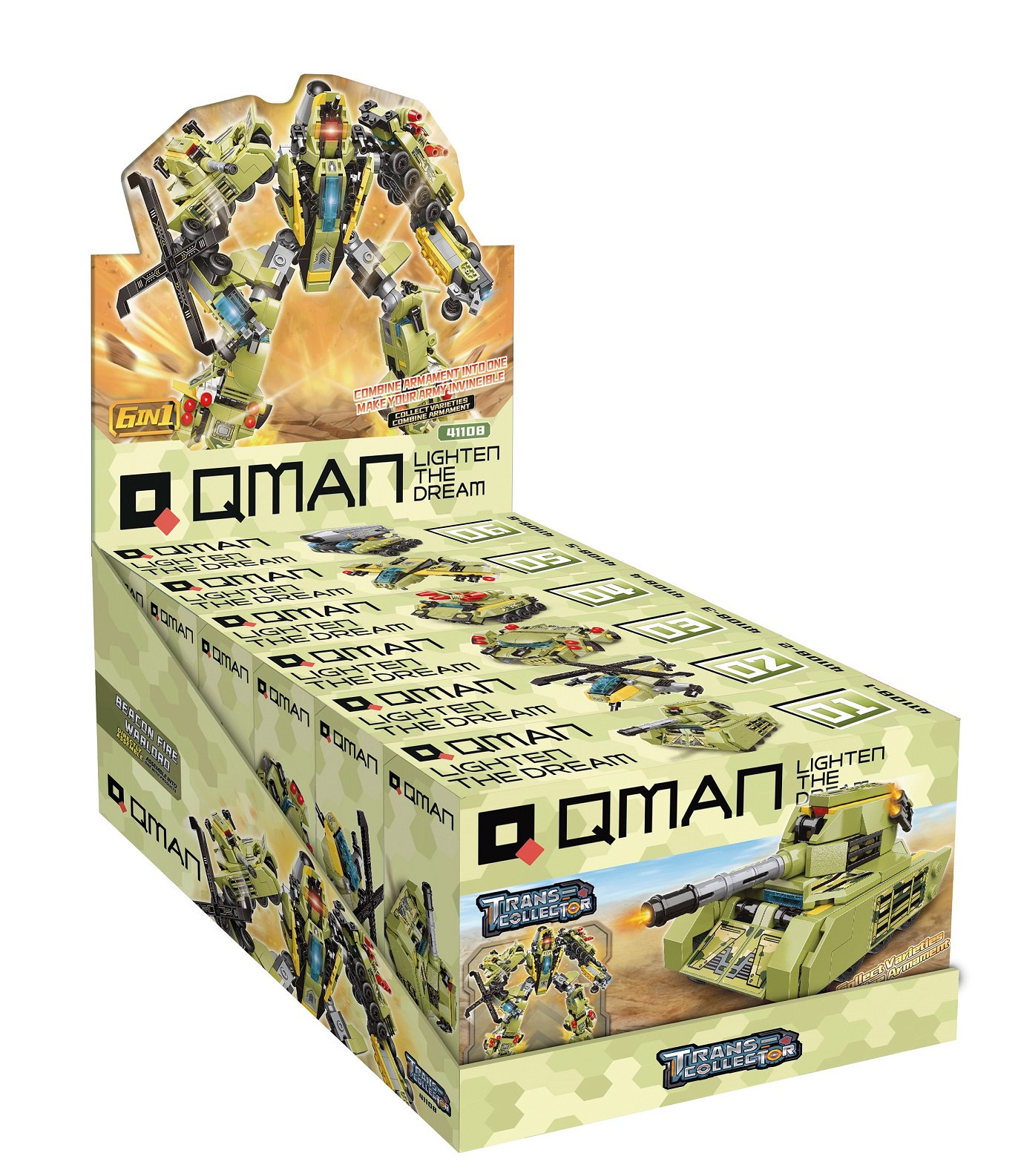 Đồ Chơi Xếp Hình, Lắp Ráp Qman 41108 - Biệt Đội Quân Sự   Bộ xếp hình QMAN 41108 là sản phẩm thuộc bộ sưu tập Trans Collector về các chiến binh người máy. Bộ xếp hình gồm 783 chi tiết với 6 hộp nhỏ: 41108-1: 115 chi tiết; 41108-2: 121 chi tiết; 41108-3: 172 chi tiết; 41108-4: 111 chi tiết; 41108-5: 128 chi tiết; 41108-6: 130 chi tiết, với mỗi hộp là các phương tiện quân sự, 6 hộp nhỏ có thể được rắp ráp thành một chiến binh Robot Quân Sự dũng mãnh. Bộ mô hình có màu sắc đẹp, chất liệu cao cấp, sinh động và trực quan. Phát triển kỹ năng: Đồ Chơi Lắp Ráp QMAN giúp cho trẻ học tập cách nhận diện đồ vật, học tập lắp ghép và kết hợp các đồ vật với nhau. Bé sẽ thỏa sức tưởng tượng và nhập vai vào trò chơi, qua đó tăng khả năng tư duy và óc sáng tạo. Sản phẩm phù hợp với các bé từ 6 tuổi trở lên.