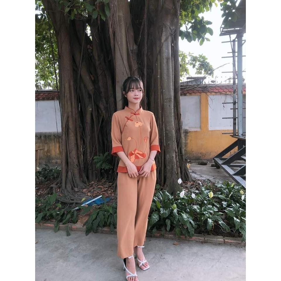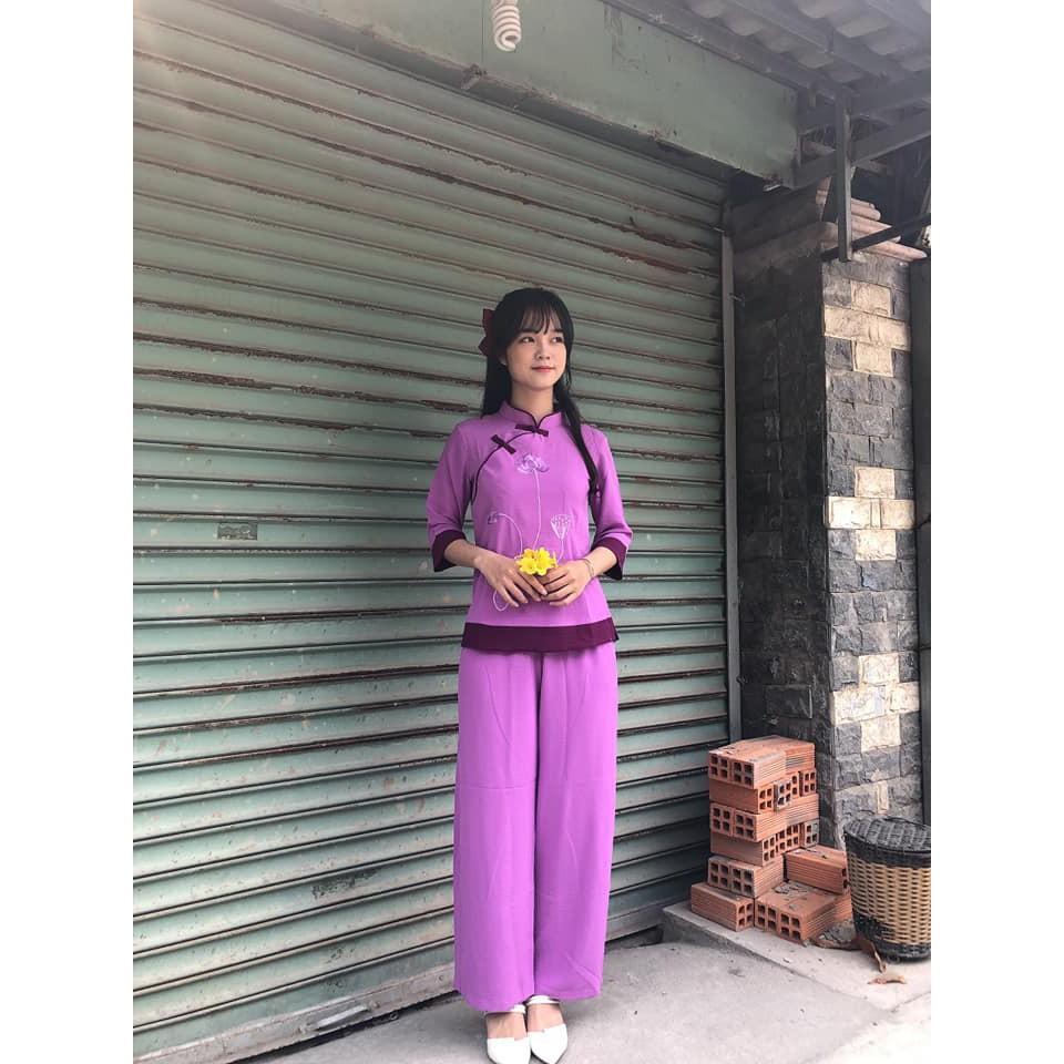 Bộ đồ lam đi chùa nữ thêu sen chất liệu đũi thái, Pháp phục lễ chùa cổ tàu phối