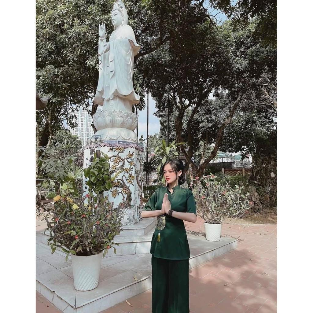 Bộ đồ lam đi chùa nữ thêu sen chất liệu đũi thái, Pháp phục lễ chùa cổ tàu phối