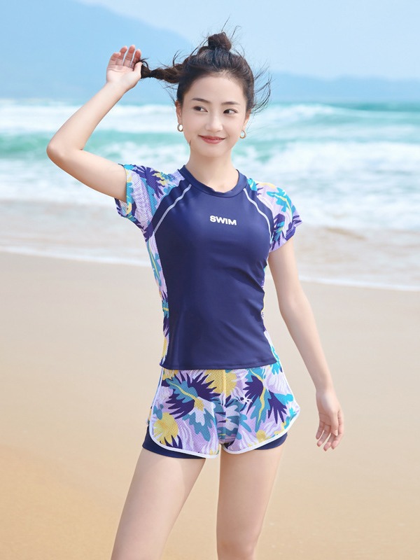- Mẫu đồ bơi mới nhất cho các bạn nữ thích sự trẻ trung kín đáo mà vẫn thu hút khi đi biển, đi bơi. - Áo dáng ngắn tay phối hoạ tiết trẻ khoẻ,