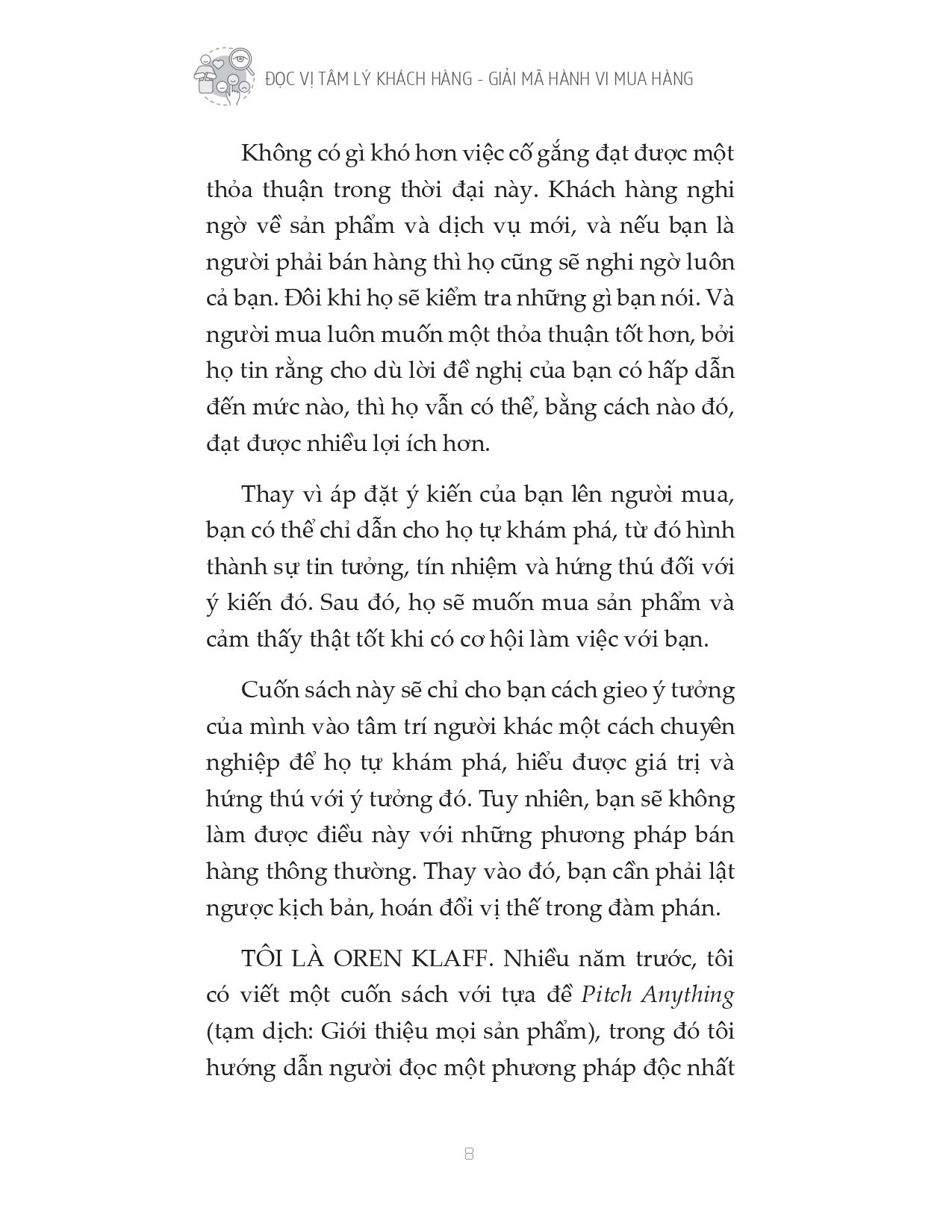 Cuốn sách “Đọc vị tâm lý khách hàng - Giải mã hành vi mua hàng” cung cấp cho bạn phương pháp bán hàng hoàn toàn mới, không chèo kéo, không gây áp lực, giúp bạn có thể bán bất kỳ thứ gì cho bất kỳ ai. Trọng tâm của cuốn sách nằm ở phương pháp gieo một ý tưởng vào tâm trí người khác, biến ý tưởng của bạn thành của người mua. Tác giả Oren hướng dẫn bạn những quy tắc “bí quyết kinh doanh” - để làm được điều đó cũng như các bước để chinh phục mục tiêu của bạn mà không cần gây áp lực lên họ. Cuốn sách này chính là chìa khóa giúp bạn “lật ngược thế cờ”, một “game changer” thực sự.