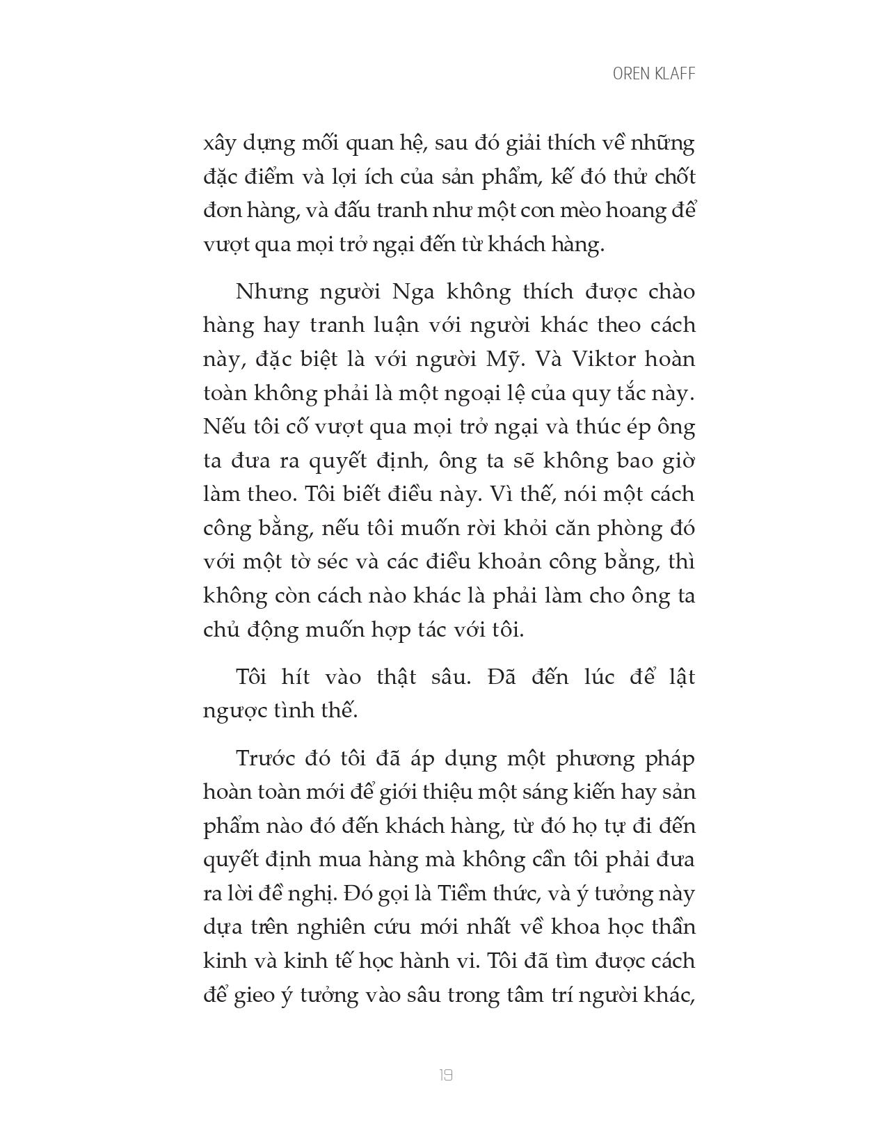 Oren Klaff là một trong những chuyên gia hàng đầu thế giới về bán hàng, huy động vốn và đàm phán. Cuốn sách đầu tiên của ông, Pitch Anything, được in hơn 1.000.000 bản trên toàn thế giới. Ông viết cho Harvard Business Review, Inc., Advertising Age, Entrepreneur và xuất hiện trên hàng trăm tạp chí, podcast và blog. Ông cũng là đối tác đầu tư trong quỹ đầu tư cổ phần tư nhân trị giá 200 triệu đô la.