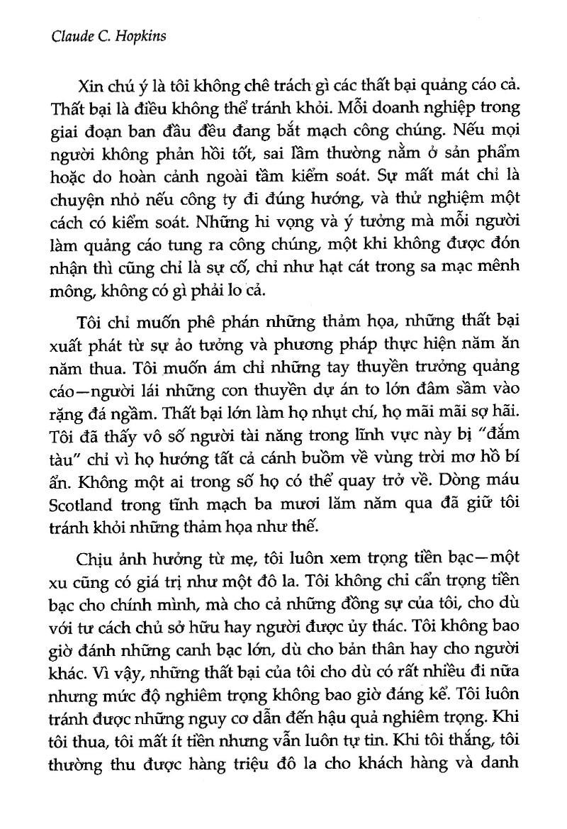 Palmolive khởi đầu chỉ với 700 USD quảng cáo thử nghiệm. Giờ đây nó là một phần của Colgate-Palmolive nổi tiếng toàn cầu. Pepsodent được sinh ra trong những đêm buồn tại một dự án thủy lợi ở Arizona. Giờ nó là một trong những nhãn hàng số một của Unilever. Goodyear đã từng chỉ dám chi 40 nghìn USD cho quảng cáo mỗi năm vì chả ai tin là có người quan tâm đến lốp xe. Giờ nó là công ty lốp xe ai ai cũng biết. Hopkins khởi đầu chỉ có 100 USD trong tay. Vào cuối đời, ông là một trong những cây đại thụ của ngành quảng cáo. Bạn thực sự không muốn nghe câu chuyện về họ sao?
