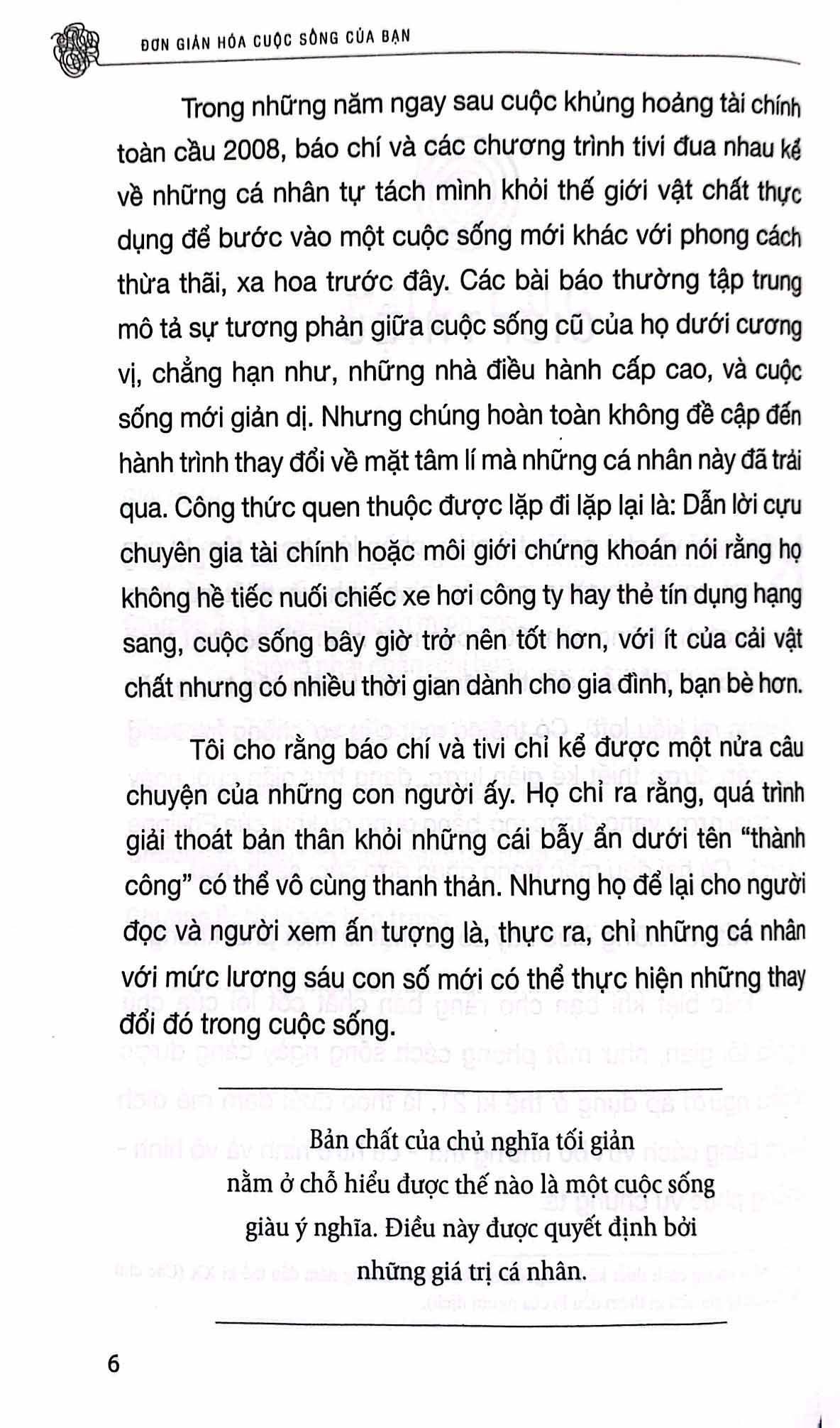 Đây là cuốn sách thực sự cần thiết được xây dựng theo phong cách dễ tiếp cận rất độc đáo trong thời điểm phức tạp và đầy thử thách này. Tác giả khuyến khích người đọc nhìn lại lối sống hiện tại một cách không phán xét và hài hước, đồng thời thực hiện lối sống tối giản để loại bỏ bớt gánh nặng cả về mặt vật chất lẫn tinh thần. Lối sống tối giản có ý nghĩa nhiều hơn là việc chỉ đơn thuần dọn dẹp bớt đồ đạc dư thừa. Cuốn sách được tác giả chấp bút với mục đích giúp các độc giả trân trọng và biết ơn nhiều hơn những điều mình đang có, tìm thấy sự giàu có và giá trị của cuộc sống sau khi bạn dọn dẹp cả không gian sống lẫn tâm trí mình để dành chỗ cho sự thỏa mãn, mục đích sống và niềm vui. Khi bạn loại bỏ tất cả những vật dụng không hữu ích, những thói quen và tư duy không mang lại giá trị nào trong cuộc sống, thì đó là lúc bạn có thêm không gian và tâm trí để kết nối với những điều phù hợp với những giá trị và mục tiêu của riêng bạn. Tối giản là chìa khóa giúp chúng ta có những lựa chọn có ý nghĩa, qua đó có thể kiểm soát cuộc sống một cách ý thức hơn. Cuốn sách được chia làm sáu phần đơn giản, rõ ràng (và ngắn gọn, trực diện) để giúp bạn bắt tay vào dọn dẹp từng khía cạnh của đời sống: căn nhà, không gian sống; công việc, chốn công sở; ví tiền, tài chính; những mối quan hệ gia đình, xã hội; đời sống trên mạng, thực tế ảo; cuối cùng là “con người bên trong bạn”. Cũng như nhiều người khác, chính bản thân tác giả Mary cũng đã sống nhiều năm với những thói quen bừa bộn trong đời sống đến khi cô nhận ra mình phải thay đổi. Sau khi áp dụng những công cụ để tối giản mọi thứ, cô nhận thấy mình đã gỡ bỏ được gánh nặng về tài chính, áp lực phải mua và kiếm tiền. Từ đó cô có được nhiều thời gian và năng lượng để tập trung được nhiều hơn vào cuộc sống, công việc, sức khỏe thể chất và tâm hồn, xây dựng những mối quan hệ có ý nghĩa cả trên mạng và ngoài đời thực. Tác giả muốn chúng ta cũng được “giải thoát” như cô, để trả lời được những câu hỏi: Bạn muốn phát triển mặt nào của đời sống? Bạn muốn thực hiện giấc mơ nào, hoàn thiện tài năng nào? Đó có thể là vẽ một bức tranh, viết một cuốn tiểu thuyết, có cuộc sống gia đình viên mãn hay đạt được sự độc lập về tài chính. Dù mục tiêu là gì, hãy nhớ “tối giản là một lối sống cho phép chúng ta thoát ra khỏi mớ bòng bong ngăn cản ta đạt được mục đích cuộc đời.” Tập trung vào niềm vui, khám phá những điều khiến bạn thấy đủ đầy và tìm được cảm giác thỏa nguyện đích thực! Thông tin về tác giả Mary Conroy là nhà báo với 20 năm kinh nghiệm viết bài cho nhiều tờ báo ở Ireland như: Daily Mail, Mail on Sunday, và Mail's You. Hiện tại cô là phó tổng biên tập của một tờ báo quốc gia ở Dublin, Ireland. Ngoài thời gian làm việc, cô còn viết sách, đạp xe, leo núi và nỗ lực sống tối giản, trở thành con người tốt hơn.