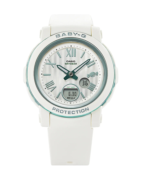 Thỏa mãn vị giác với mẫu đồng hồ BABY-G màu kẹo. Ngoài mặt số kẻ sọc, đường gờ kim loại và vạch chỉ giờ, mẫu thiết kế bọc kẹo này còn tạo thêm điểm nhấn năng động khác lạ với viên kẹo ở vị trí 3 giờ. Mẫu đồng hồ không chỉ ngọt ngào mà còn có tính thực tiễn cao với cấu trúc chống va đập và khả năng chống nước ở độ sâu 100 mét.