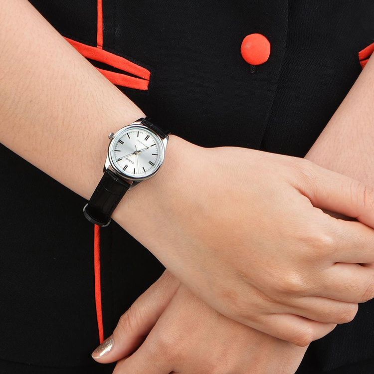 - Đồng Hồ Nữ Dây Da Casio LTP-V005L-7AUDF (28mm) có mặt đồng hồ tròn màu bạc, nổi bật trên dây da đen sang trọng và cổ điển. - Sử dụng chất liệu mặt kính khoáng