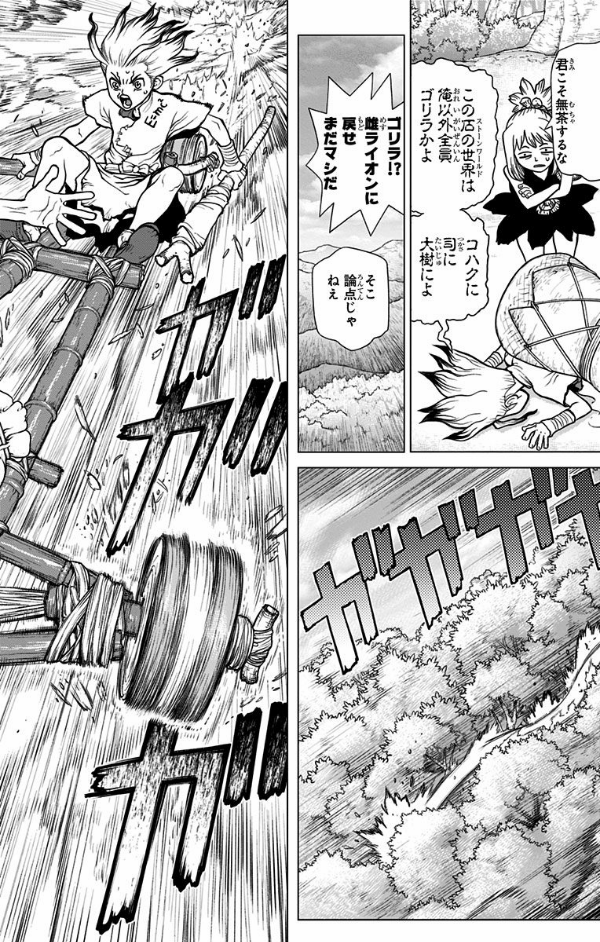 コハクの村にやってきた千空は村人たちを仲間にしようと目論む。手始めに科学対決を制し少年を助手にゲットした千空は、コハク姉の病を治そうと万能薬開発に乗り出す。科学王国を興すための挑戦が始まる!!