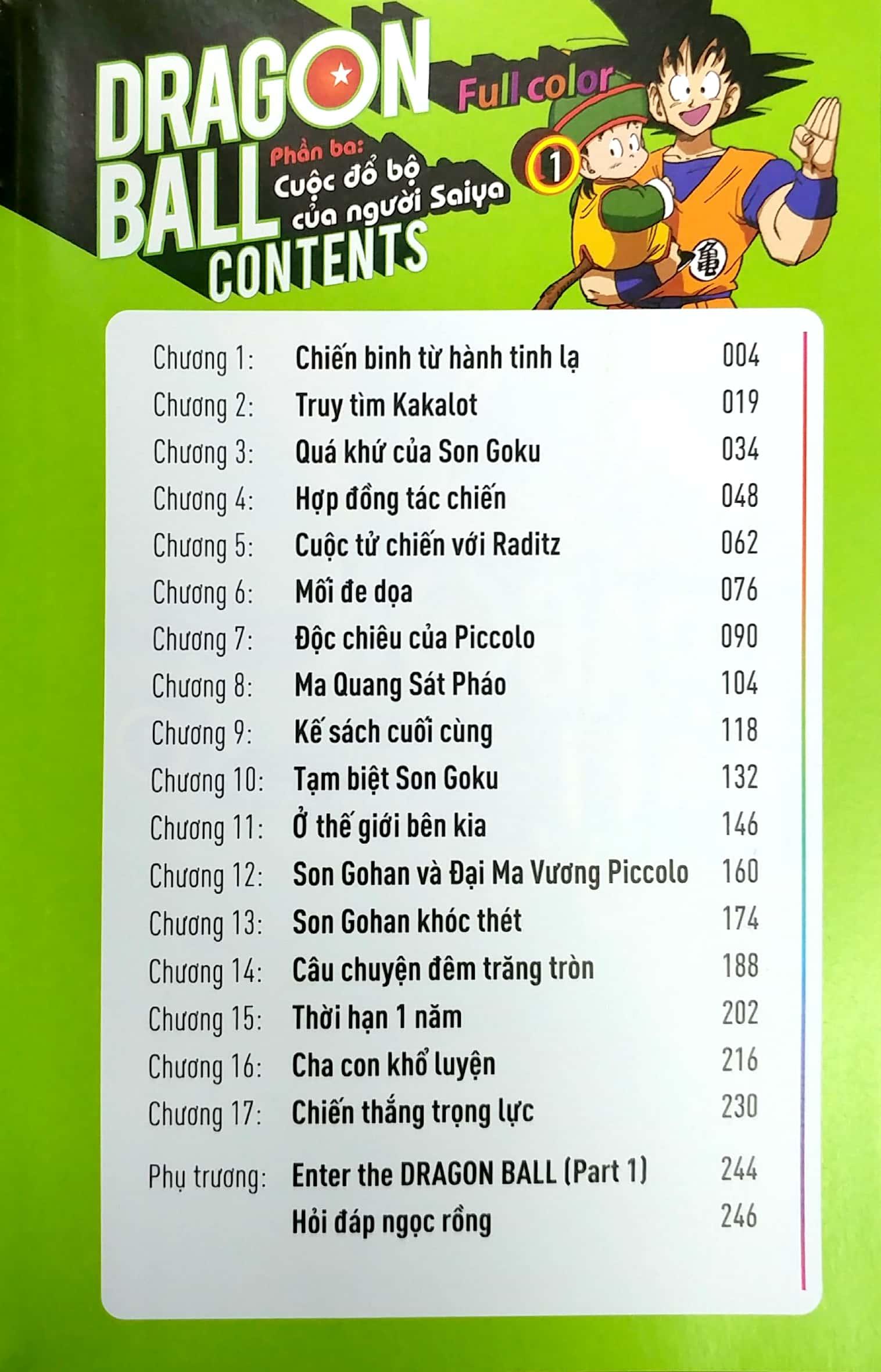Mua tại TiktokSau Đại hội võ thuật lần thứ 23, Đại Ma Vương Piccolo không còn quấy rối dân lành nữa. Goku và các bạn quay trở về cuộc sống bình thường. Anh đã kết hôn với Chichi, con gái của Ngưu Ma Vương và có một cậu con trai tên là Gohan. Trong một lần Goku đưa Gohan đến đảo Rùa chơi thì bỗng có một kẻ ăn vận kì lạ, tự xưng là anh trai ruột của Son Goku xuất hiện. Hắn đã tiết lộ một điều khủng khiếp về thân thế thật của Goku rồi bắt cóc Gohan đem đi mất. Xin mời các bạn tiếp tục theo dõi phần truyện màu đầy kịch tính tiếp theo của 7 Viên Ngọc Rồng: Dragon Ball Full Color: Cuộc đổ bộ của người Saiya.