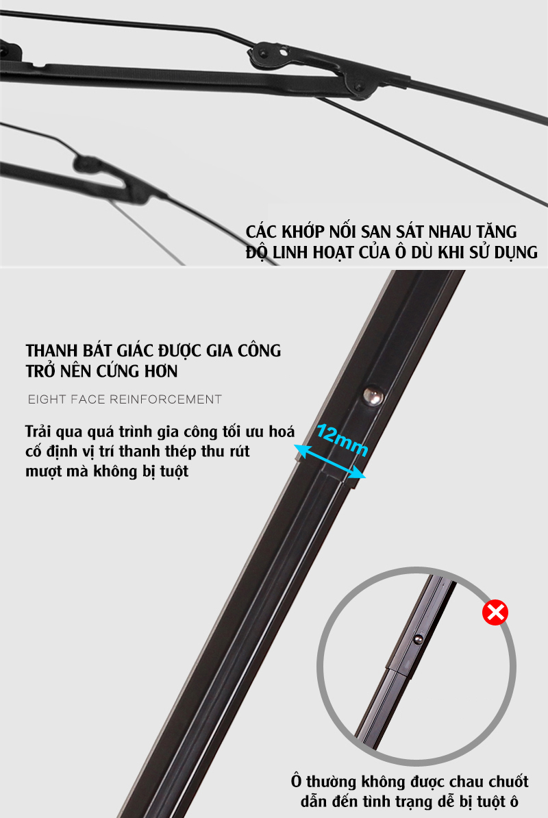 - Thanh bát giác được gia công cứng cáp, các khớp nối san sát nhau tăng độ linh hoạt cho ô dù khi sử dụng