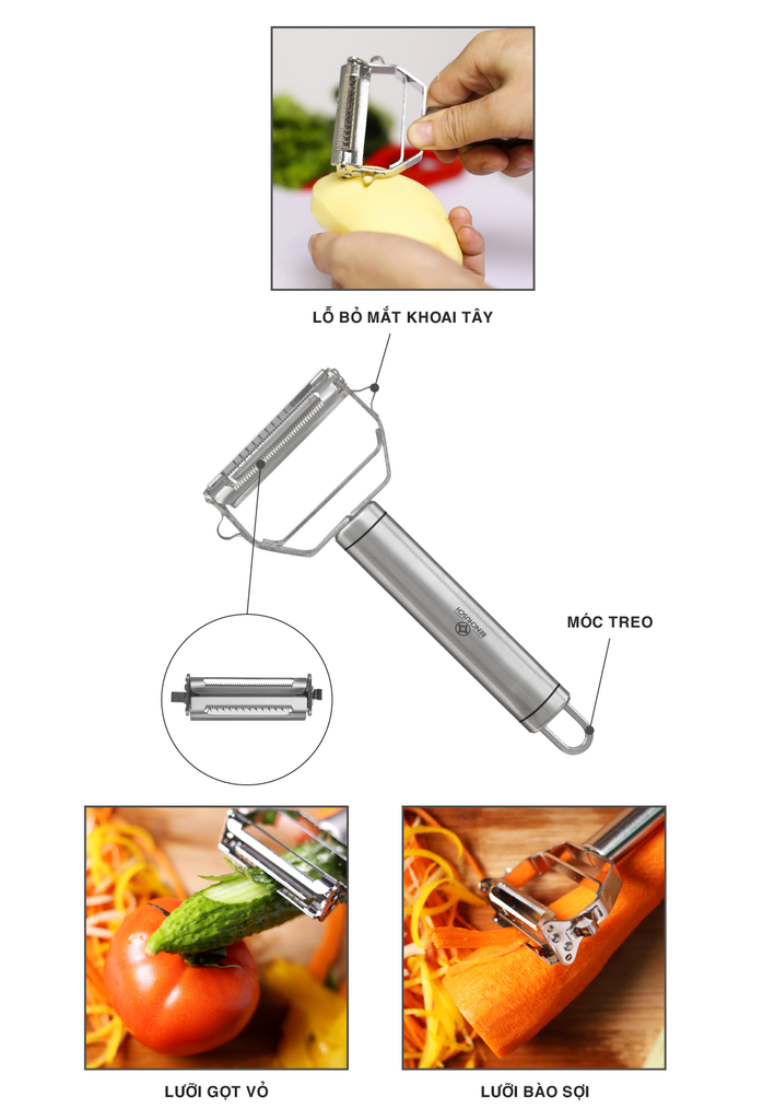 Dao Bào Gọt KHOAI TÂY ĐA NĂNG 3IN1 INOX. Dụng cụ GỌT VỎ, BÀO SỢI, Đỉnh dao dùng cắt loại bỏ phần hư RAU CỦ QUẢ. Dụng cụ nhà bếp TIỆN LỢI Sản phẩm
