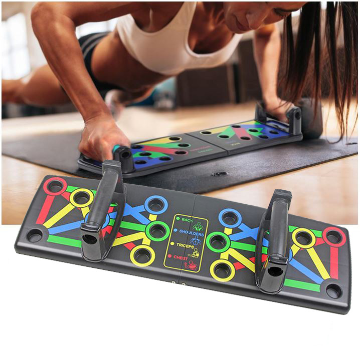- Dụng cụ tập thể hình, hỗ trợ chống đẩy , hít đất có các khấc luyện tập tương ứng với các mô cơ trên cơ thể, như cơ bắp tay, cơ Bộ dụng cụ đầy đủ gồm: 1 bảng đế hướng dẫn + 2 tay nắm + đế cao su Thiết kế với 4 màu tương ứng với 4 khu vực các tay cầm bỏ vào vị trí muốn tập tương ứng