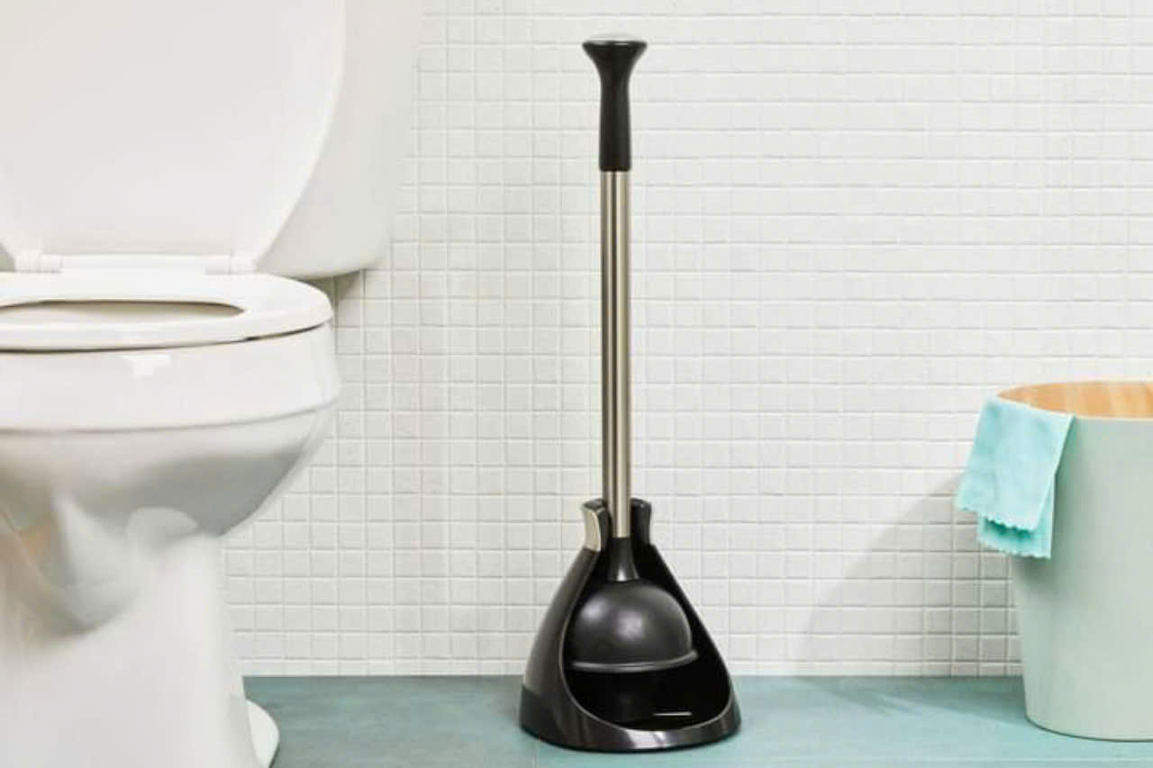 Dụng cụ thông tắc bồn cầu Simplehuman bao gồm 1 thanh pít tong và 1 giá đỡ chống nhỏ giọt
