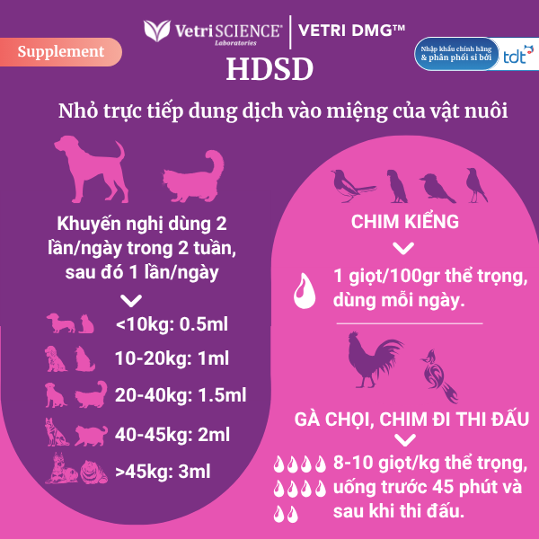 Sản phẩm Vetri DMG chứa thành phần chủ đạo là N,N-Dimethylglycine đóng vai trò như một adaptogen, mang lại hơn 40 lợi ích cho sức khỏe, đặc biệt giúp tăng cường miễn dịch và sức bền của thú cưng.
