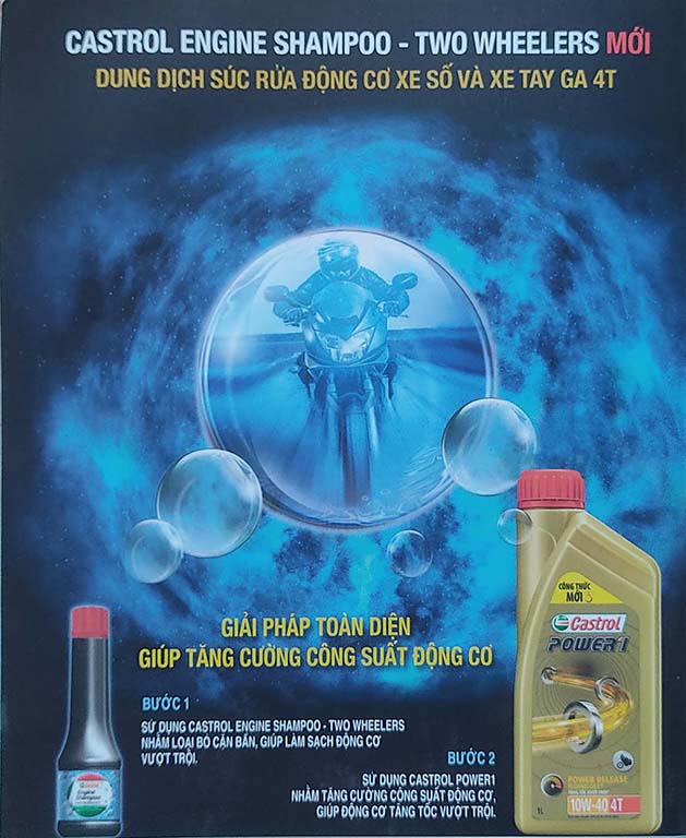 Mua tại TiktokĐiều kiện lái xe hiện đại khiến động cơ xe máy làm việc khắc nghiệt hơn, hình thành bụi bẩn và cặn bùn tích tụ bên trong động cơ. Nếu không được loại bỏ hoàn toàn khi thay dầu động cơ, các cặn bẩn này gây ảnh hưởng trực tiếp đến hoạt động của động cơ. Castrol Engine Shampoo - Two Wheelers là giải pháp súc rửa động cơ trước khi thay dầu, loại bỏ đến 85% cặn bẩn* bên trong động cơ, giúp làm sạch động cơ hiệu quả. Lợi điểm Làm sạch vượt trội giúp tăng cường công suất động cơ. Hướng dẫn sử dụng: Chuẩn bị: